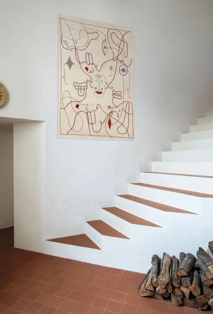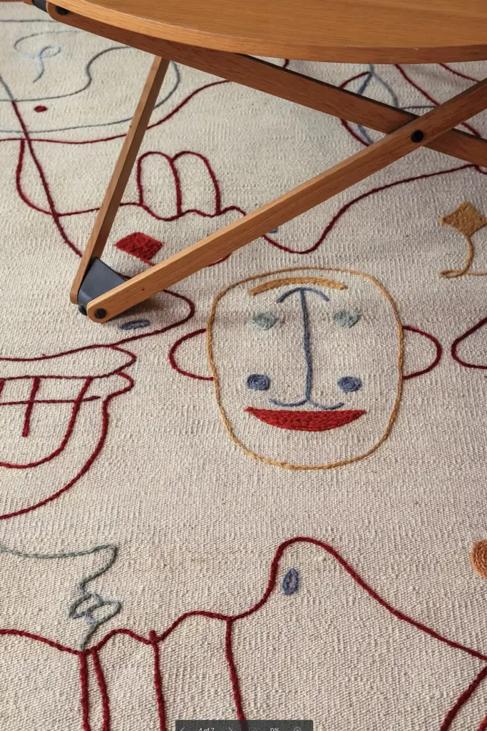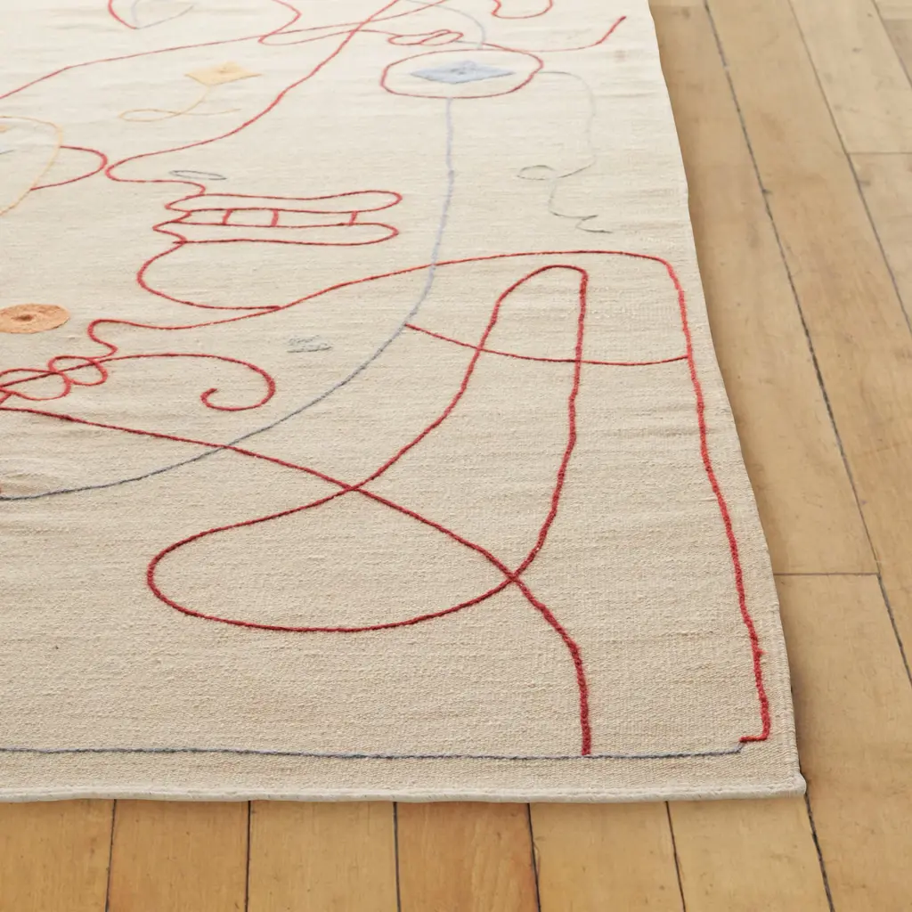 Look closely at the Silhouette Rug (2020) and you'll see nine faces, located at different angles. Designer Jaime Hayon placed these imaginary characters that way so that no matter where in the room you are, at least one will be smiling, shyly glancing, or making silly expressions at you. The faces, chain-stitched into the 100% wool floor covering, also have eyes rendered in different colors and shapes; perhaps a sly nod to famed surrealist -- and fellow Spaniard -- Joan Miro. The flat-weave Silhouette is suitable for residential and commercial use. It also may be hung on the wall. Part of the Hayon x Nani collection. Made in Pakistan.