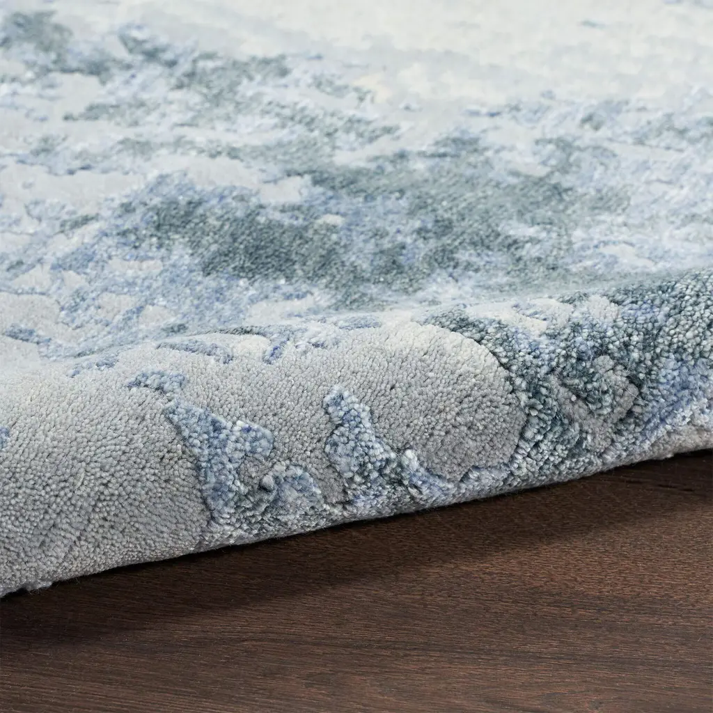 Shades of blue, grey, and ivory flow like frosted glass across the surface of this abstract rug from the Silk Shadows Collection. Luxurious New Zealand wool is blended with silk-like bamboo fibers that beautifully capture the light, finished with subtly carved accents that create a striking foundation in your favorite space.Redefine opulence with this luxurious collection of stunningly elegant rugs. Hand woven from premium wool and silk-like bamboo fibers, each velvety soft rug possesses a subtle yet luminous sheen. Designs feature contemporary and transitional motifs with tasteful colors and tone-on-tone contrasts. Ships In 7-10 Business Days In Stock Early January 2026 In Stock Early January 2026 Ships In 7-10 Business Days Carved accents add a subtle layer of depth Abstract rug design in blue, grey, and ivory Medium thick, 0.50” pile Handmade blend of 25% New Zealand wool, 75% bamboo extruded silk Slight variations in color from product to product are natural characteristics of high quality handcrafted home decor. Your product may not exactly match what is pictured on this page.