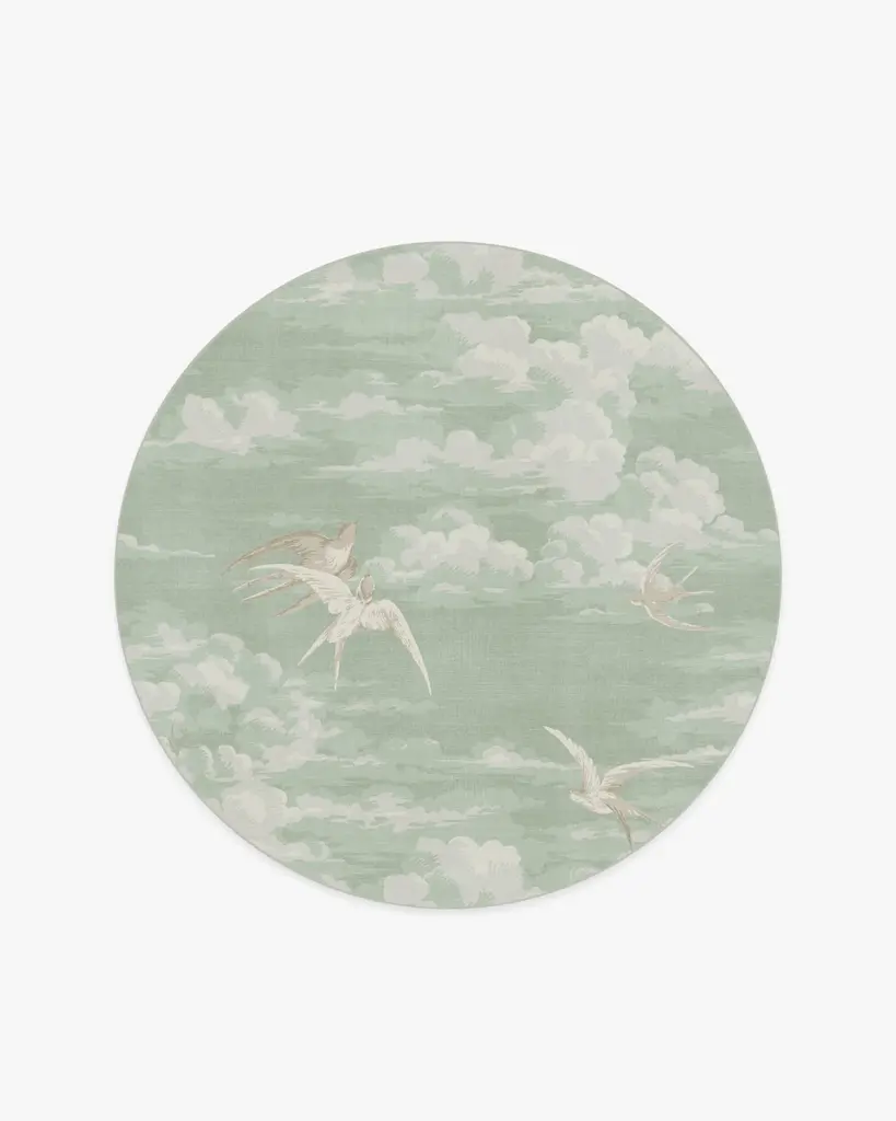 Add idyllic charm to any room with our Sanderson Silvi Clouds Seaspray Rug. Referencing two Sanderson designs, Silvi Clouds and Swallows, this rug features playful swallows soaring through a calm, cloudy skyscape. The gentle movement of the birds, set against the backdrop of soft, swirling clouds, creates a soothing aesthetic. A palette of creams and beiges blended with shades of sage adds an airy feel to your home. Water-resistant, stain-resistant, and machine-washable. Rug colors may vary slightly according to your device and the lighting in your space.