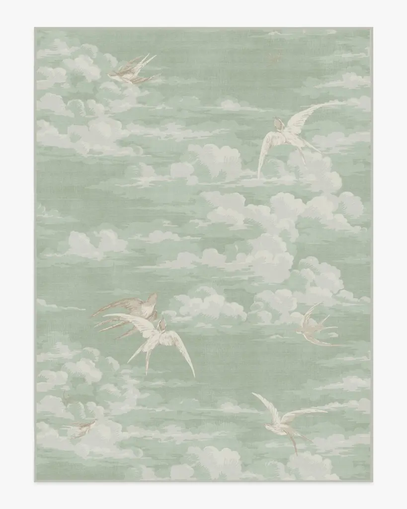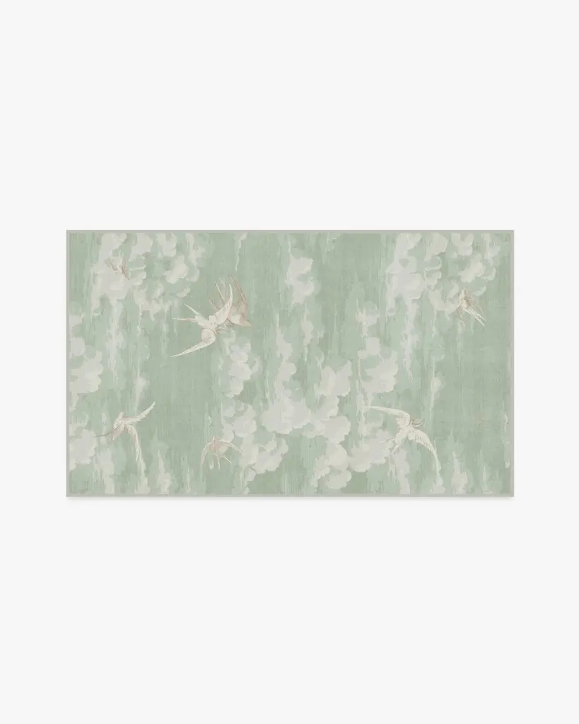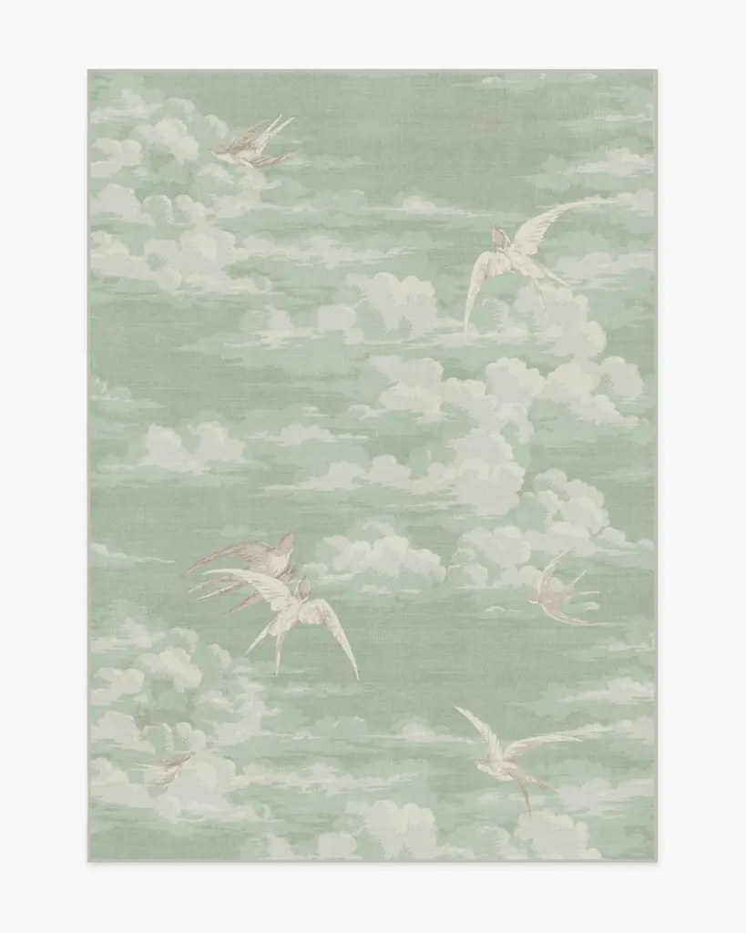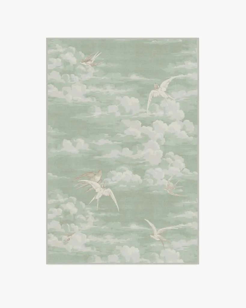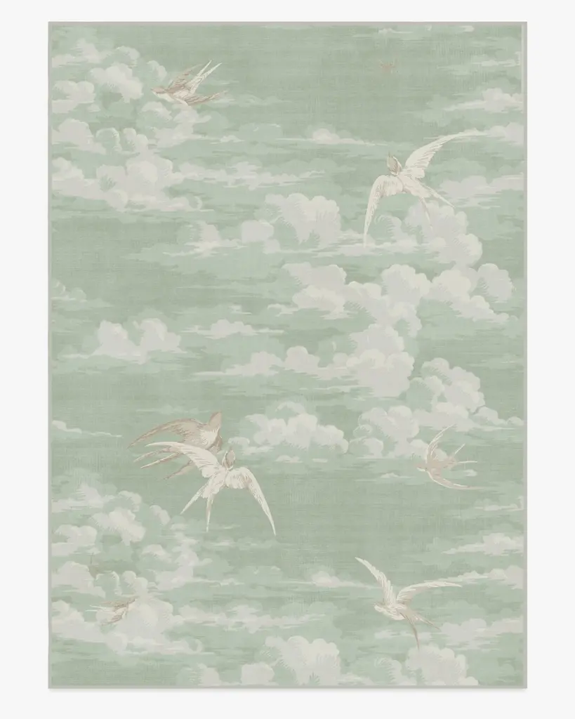 Add idyllic charm to any room with our Sanderson Silvi Clouds Seaspray Rug. Referencing two Sanderson designs, Silvi Clouds and Swallows, this rug features playful swallows soaring through a calm, cloudy skyscape. The gentle movement of the birds, set against the backdrop of soft, swirling clouds, creates a soothing aesthetic. A palette of creams and beiges blended with shades of sage adds an airy feel to your home. Water-resistant, stain-resistant, and machine-washable. Rug colors may vary slightly according to your device and the lighting in your space.