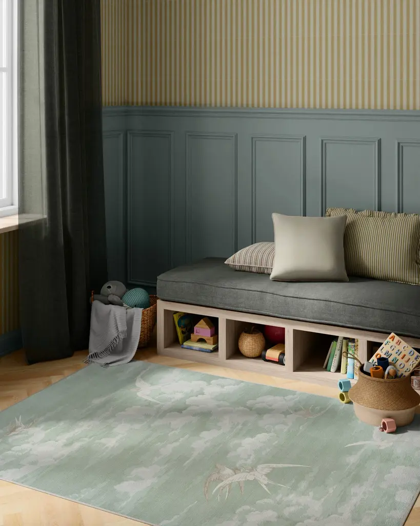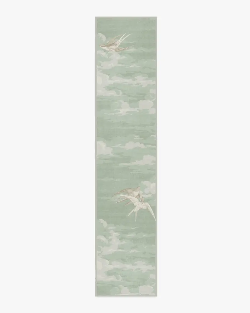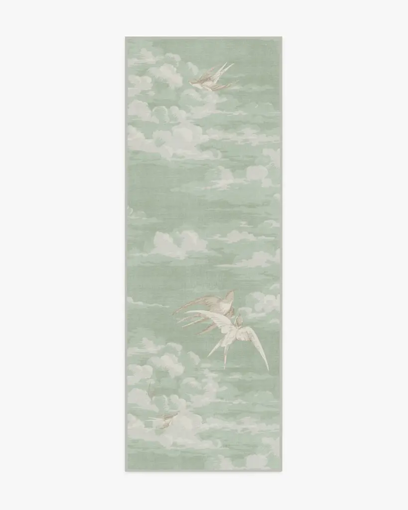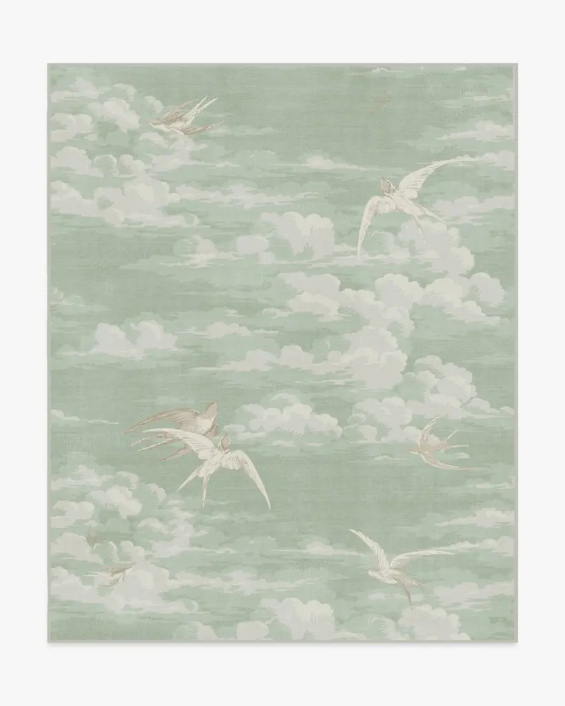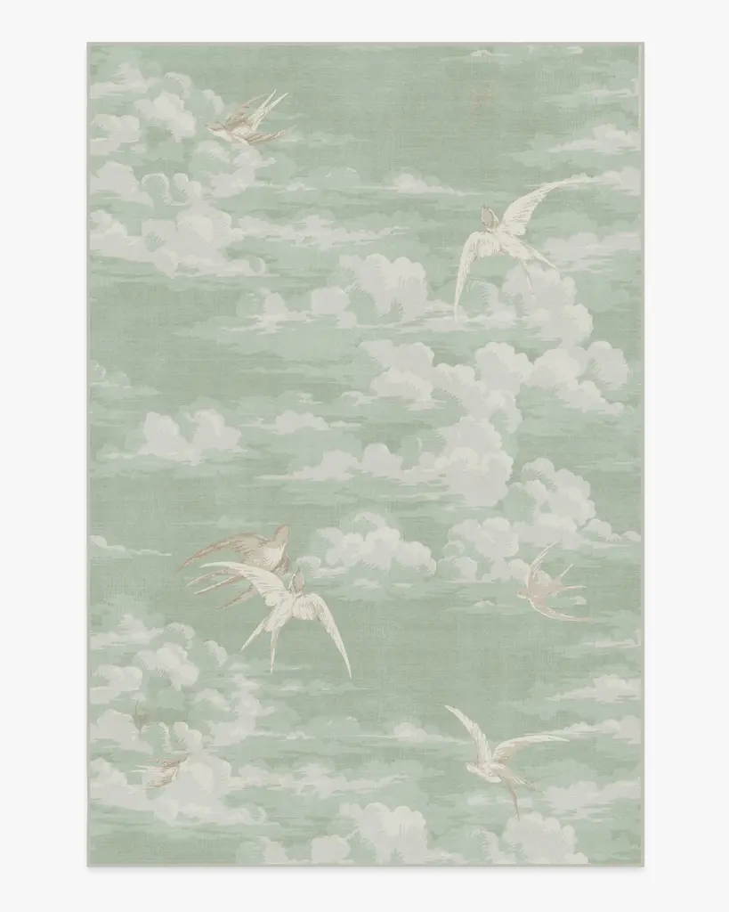 Add idyllic charm to any room with our Sanderson Silvi Clouds Seaspray Rug. Referencing two Sanderson designs, Silvi Clouds and Swallows, this rug features playful swallows soaring through a calm, cloudy skyscape. The gentle movement of the birds, set against the backdrop of soft, swirling clouds, creates a soothing aesthetic. A palette of creams and beiges blended with shades of sage adds an airy feel to your home. Water-resistant, stain-resistant, and machine-washable. Rug colors may vary slightly according to your device and the lighting in your space.
