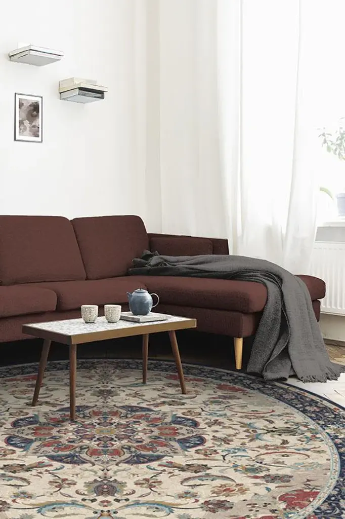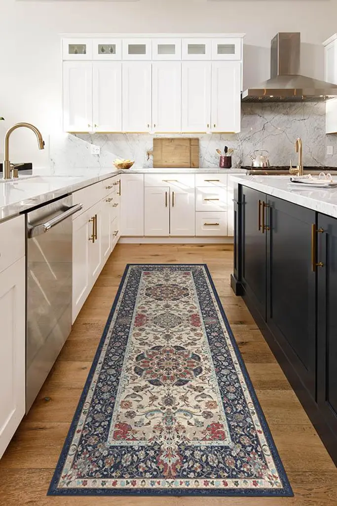 The Sima Royal Blue features a globally inspired floral design. Its leafy floral motif is accentuated by a deep blue border and rich red corner accents.
