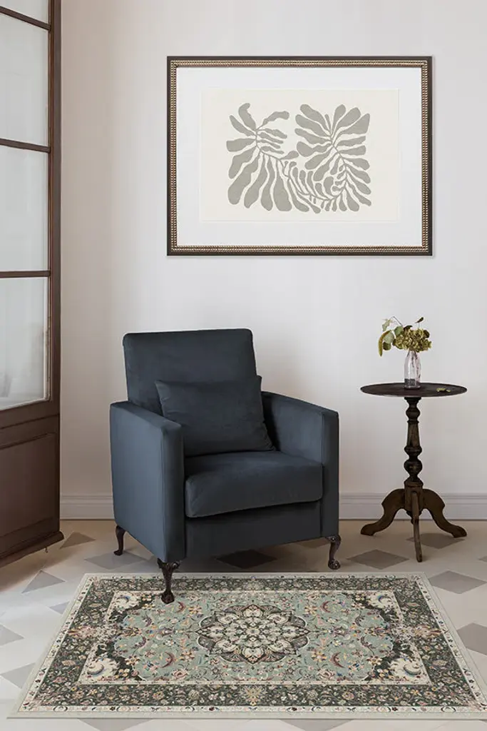 The Sima Sage Green Rug features a globally inspired floral design. With a bordered leafy design in shades of sage and hunter green, this classic rug will elevate any room.