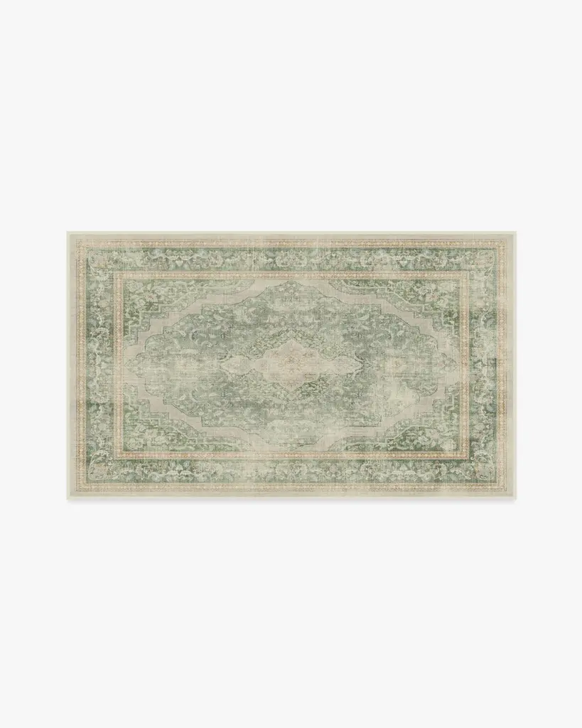 The Sima Sage Green Rug features a globally inspired floral design. With a bordered leafy design in shades of sage and hunter green, this classic rug will elevate any room. Water-resistant, stain-resistant, and machine-washable. Rug colors may vary slightly according to your device and the lighting in your space.