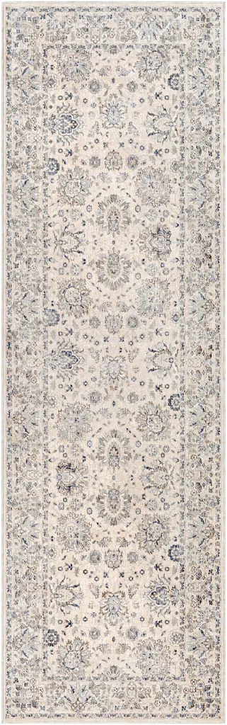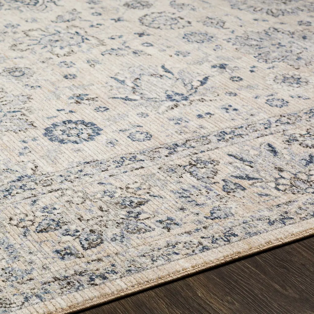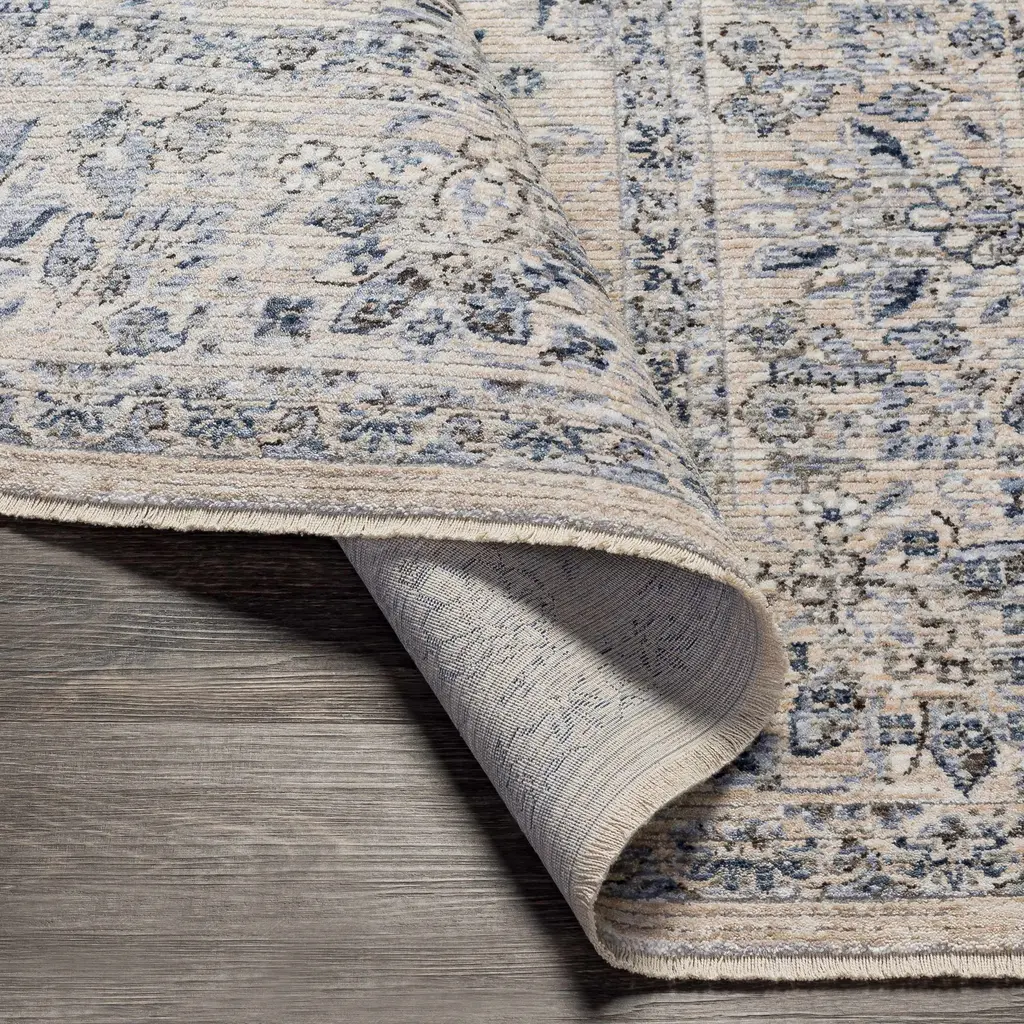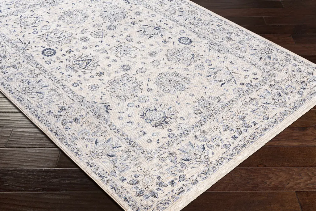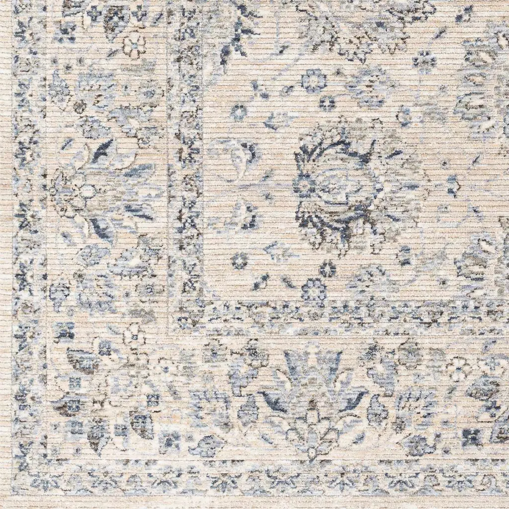 Collection: Simod Colors: Blue, Charcoal, Gray, Pale Blue, Navy, Beige Construction: Machine Woven Material: 100% Polyester Pile: Medium Pile Pile Height: 0.24" Styles: Traditional Made In: Turkey Thickness: 0.31" Fringe Length: 0.6" Price Range: $$$$$ (Affordable)