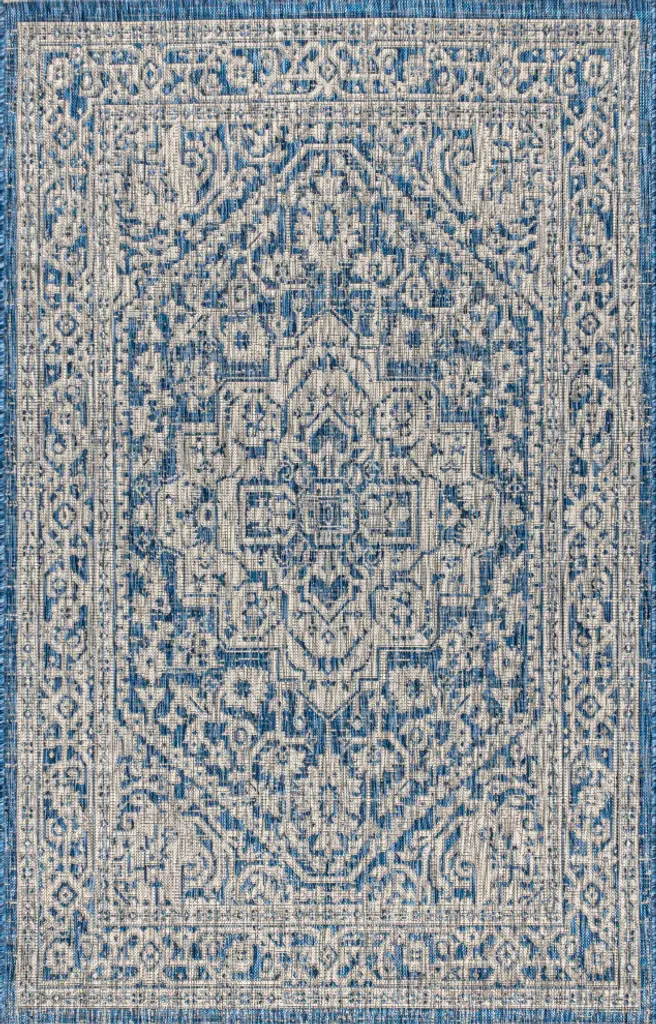 This ornate medallion rug''s lively pattern adds exotic style to an outdoor porch or patio. Varied tones of teal and dark blue mingled with a gray pattern give this rug a hand-woven, vintage vibe. The flatweave design is great for high-traffic spaces indoors too. Features:• Flat-weave construction of 100% polypropylene• Deep teal blue and gray with a handwoven mingled texture• Water resistance with 0.19" pile• 100% Polypropylene• No backing, use of rug pad is recommended (sold separately)• Power Loomed in Turkey• Actual Dimension: 5 ft. 3 in. x 5 ft. 3 in. Square• Color: Teal Blue/Gray• Thickness measures: 0.19 in.• Available in multiple sizes and/or colorsRug Care:• Vacuum regularly and spot clean as needed; avoid direct and continuous exposure to sunlight; use brushless vacuum; remove spills immediately; if liquid, blot with clean, undyed cloth by pressing firmly around the spill to absorb as much as possible; for hard to remove stains, professional rug cleaning is recommended; store in a dry, well ventilated area and rotate for consistent wear• Packing and shipping may cause temporary creases in rugs, which will flatten out after a week on the floor; to expedite the process, try back-rolling your rug before laying it down, and then allow ample time for the remaining creases to relax• Please Note: Due to differences in monitors, some rug colors may vary slightly. Lengths and widths may vary from the published dimensions. Patterns may vary slightly according to shape and size selected.About us:Style your floors with JONATHAN Y. By combining fine craftsmanship and design, this New York creative studio is bringing fashion to your floors. The collection mixes sustainable organic materials, vibrant colors and trend worthy styles to create JONATHAN Y''s distinctive catalog of rugs.