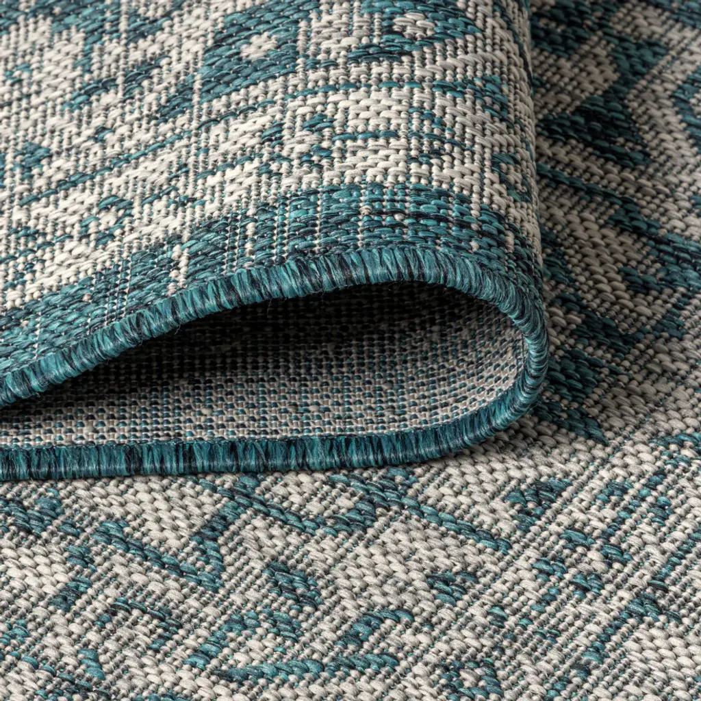 This ornate medallion rug''s lively pattern adds exotic style to an outdoor porch or patio. Varied tones of teal and dark blue mingled with a gray pattern give this rug a hand-woven, vintage vibe. The flatweave design is great for high-traffic spaces indoors too. Features:• Flat-weave construction of 100% polypropylene• Deep teal blue and gray with a handwoven mingled texture• Water resistance with 0.19" pile• 100% Polypropylene• No backing, use of rug pad is recommended (sold separately)• Power Loomed in Turkey• Actual Dimension: 7ft. 9 in. x 10 ft.• Color: Teal Blue/Gray• Thickness measures: 0.19 in.• Available in multiple sizes and/or colorsRug Care:• Durable and easy-care - just sweep or hose down with mild soap and water• Packing and shipping may cause temporary creases in rugs, which will flatten out after a week on the floor; to expedite the process, try back-rolling your rug before laying it down, and then allow ample time for the remaining creases to relax• Please Note: Due to differences in monitors, some rug colors may vary slightly. Lengths and widths may vary from the published dimensions. Patterns may vary slightly according to shape and size selected.About us:Style your floors with JONATHAN Y. By combining fine craftsmanship and design, this New York creative studio is bringing fashion to your floors. The collection mixes sustainable organic materials, vibrant colors and trend worthy styles to create JONATHAN Y''s distinctive catalog of rugs.