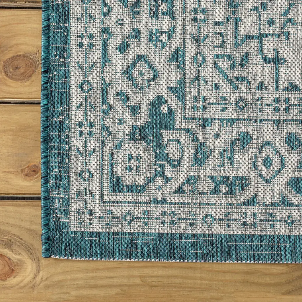 This ornate medallion rug''s lively pattern adds exotic style to an outdoor porch or patio. Varied tones of teal and dark blue mingled with a gray pattern give this rug a hand-woven, vintage vibe. The flatweave design is great for high-traffic spaces indoors too. Features:• Flat-weave construction of 100% polypropylene• Deep teal blue and gray with a handwoven mingled texture• Water resistance with 0.19" pile• 100% Polypropylene• No backing, use of rug pad is recommended (sold separately)• Power-loomed in Turkey• Actual Dimension: 9 ft. x 12 ft.• Color: Teal Blue/Gray• Thickness measures: 0.19 in.• Available in multiple sizes and/or colorsRug Care:• Durable and easy-care - just sweep or hose down with mild soap and water• Packing and shipping may cause temporary creases in rugs, which will flatten out after a week on the floor; to expedite the process, try back-rolling your rug before laying it down, and then allow ample time for the remaining creases to relax• Please Note: Due to differences in monitors, some rug colors may vary slightly. Lengths and widths may vary from the published dimensions. Patterns may vary slightly according to the shape and size selected.About us:Style your floors with JONATHAN Y. By combining fine craftsmanship and design, this New York creative studio is bringing fashion to your floors. The collection mixes sustainable organic materials, vibrant colors and trend-worthy styles to create JONATHAN Y''s distinctive catalog of rugs.