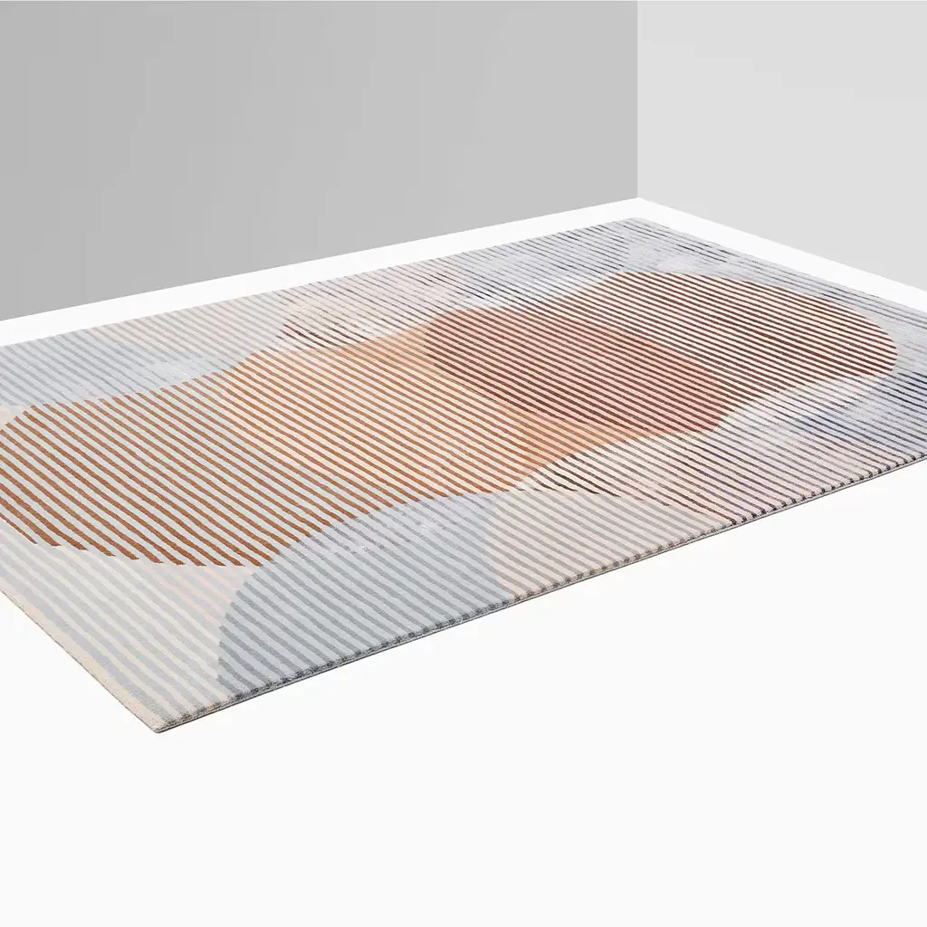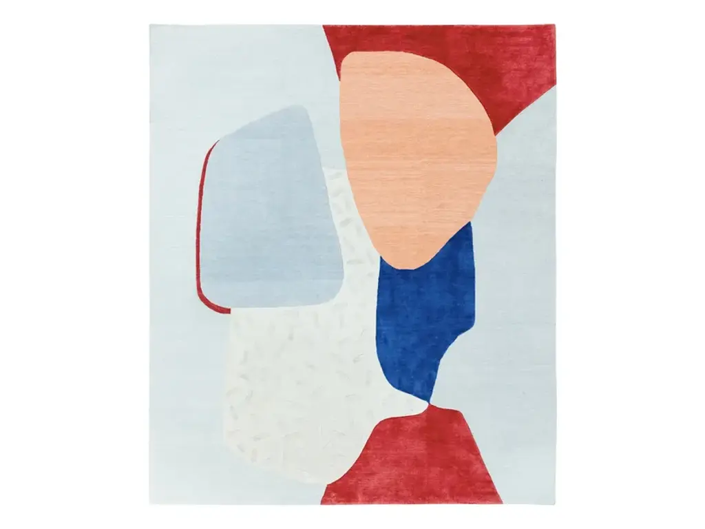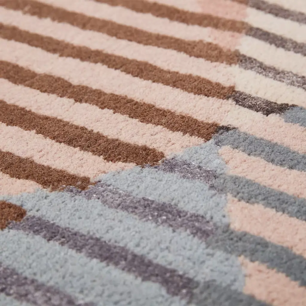 Designed by polish designer Alicia Palys, this hand-tufted wool and viscose rug features large circles in a delicate palette of roses, light blues and grays on a background of stripes, creating an aesthetic and delicate optical effect. Its dimensions are 200x290 centimeters – although the size is customizable – with 10 mm pile height. Available in 70 days from order.