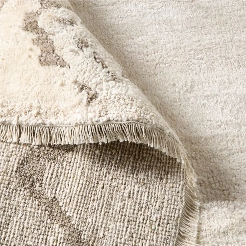 Knotted by hand of 100% viscose, rug by Kravitz Design features a low pile and lustrous cool white sheen that enhance its subtle monochromatic pattern. A grey green abstract geometric border lends a modernist touch, while delicate fringe finishes the short ends. CB2 exclusive.How will it look in your room? 12"x12" rug samples are available in stores for a fee refundable upon return of the sample.