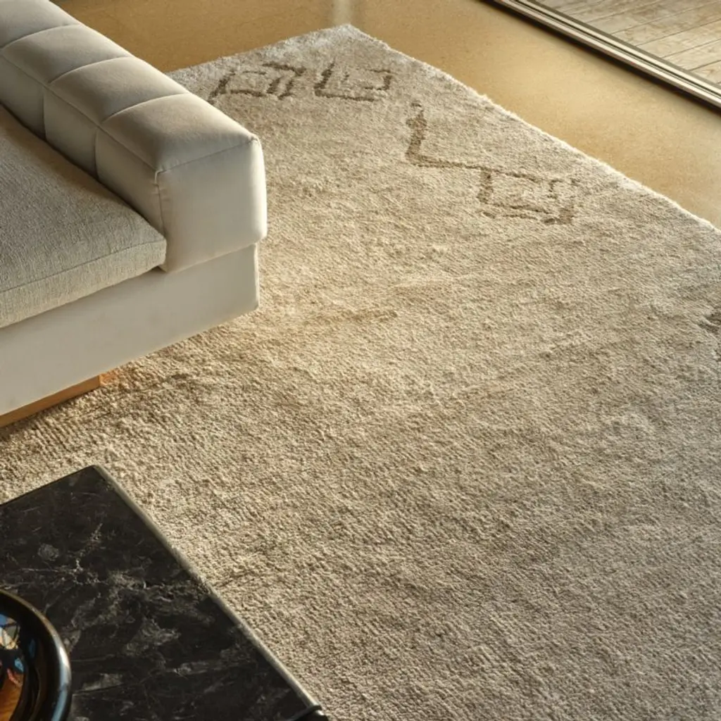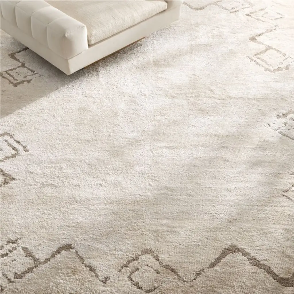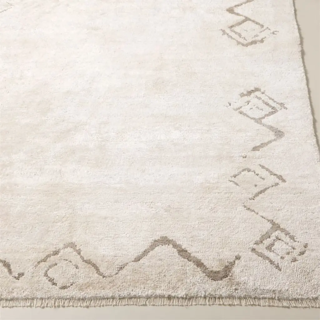 Knotted by hand of 100% viscose, rug by Kravitz Design features a low pile and lustrous cool white sheen that enhance its subtle monochromatic pattern. A grey green abstract geometric border lends a modernist touch, while delicate fringe finishes the short ends. CB2 exclusive.How will it look in your room? 12"x12" rug samples are available in stores for a fee refundable upon return of the sample.