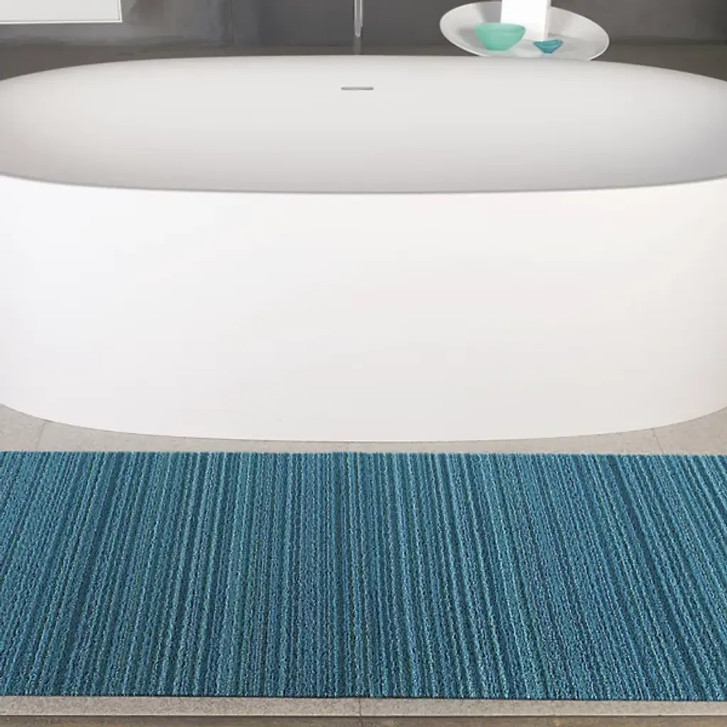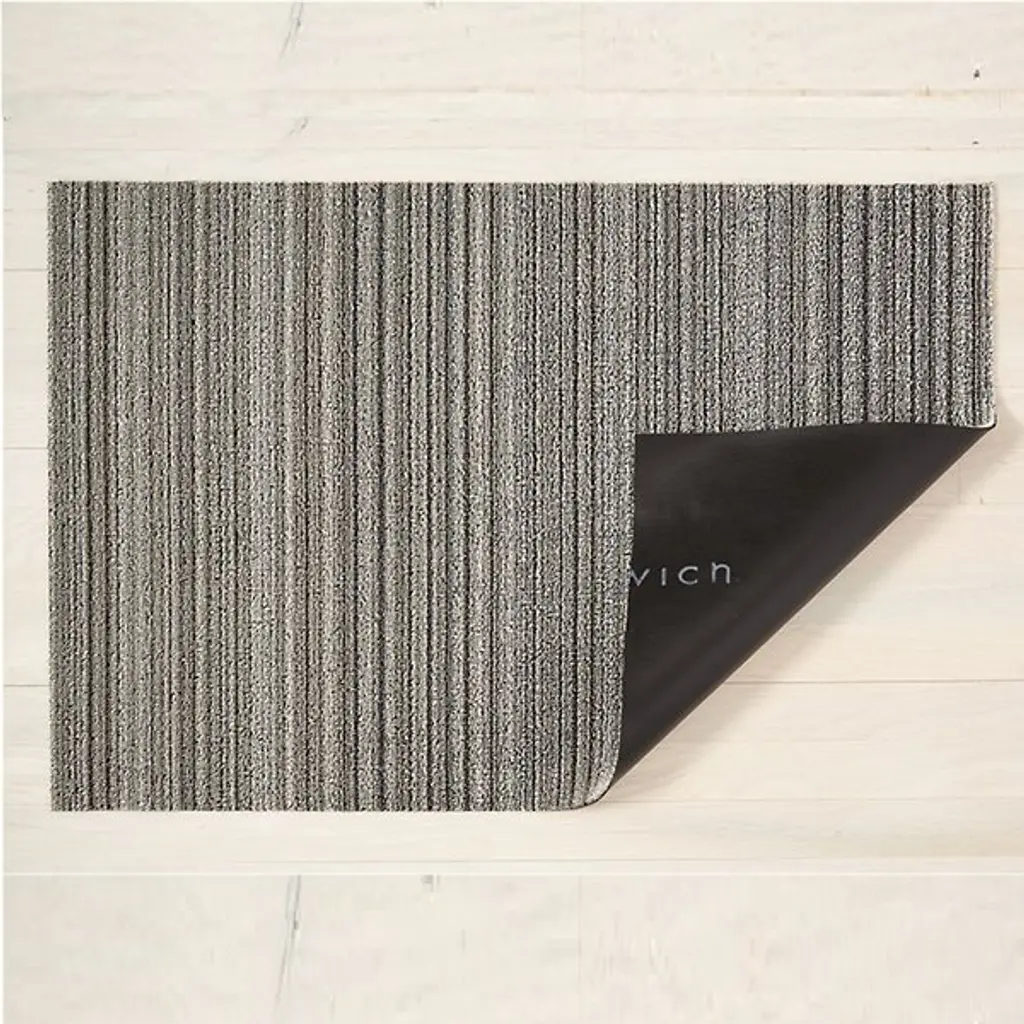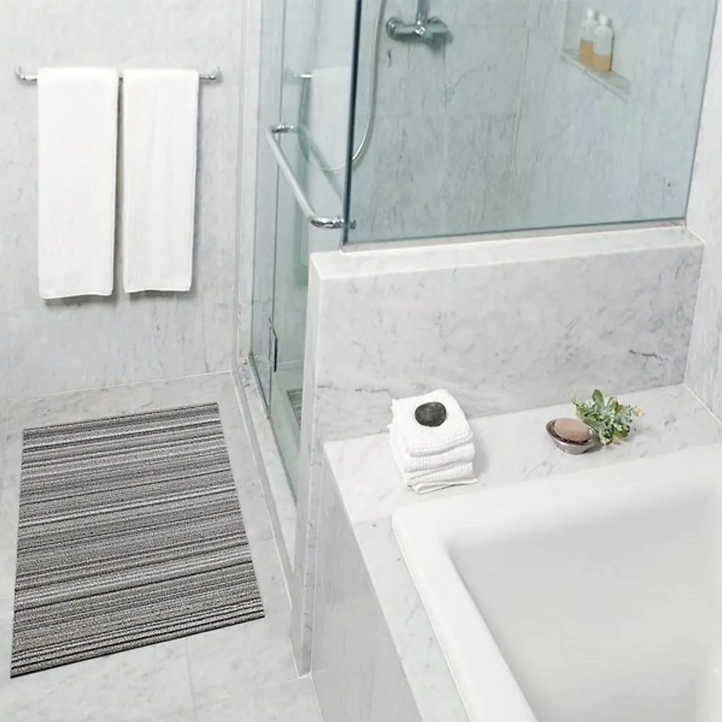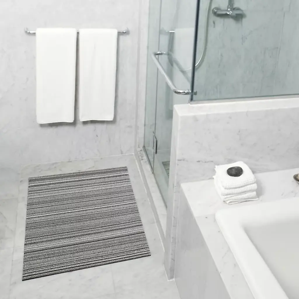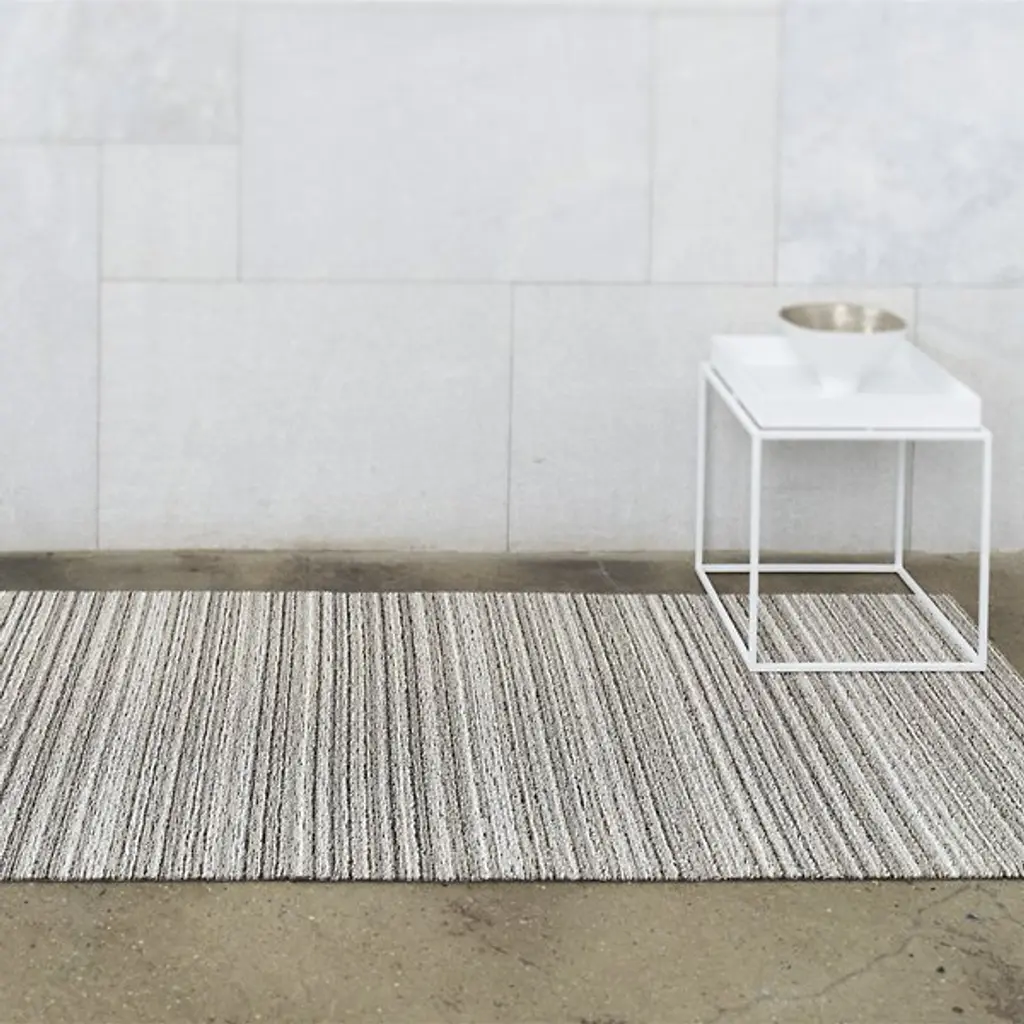 Quick to dry and mold and mildew resistant, the Chilewich Skinny Stripe Shag Indoor/Outdoor Mat is a great option for near showers and front and back doors. The rug is tufted from durable vinyl yarns to create its textured shag look. Made in the USA; designed by Sandy Chilewich.