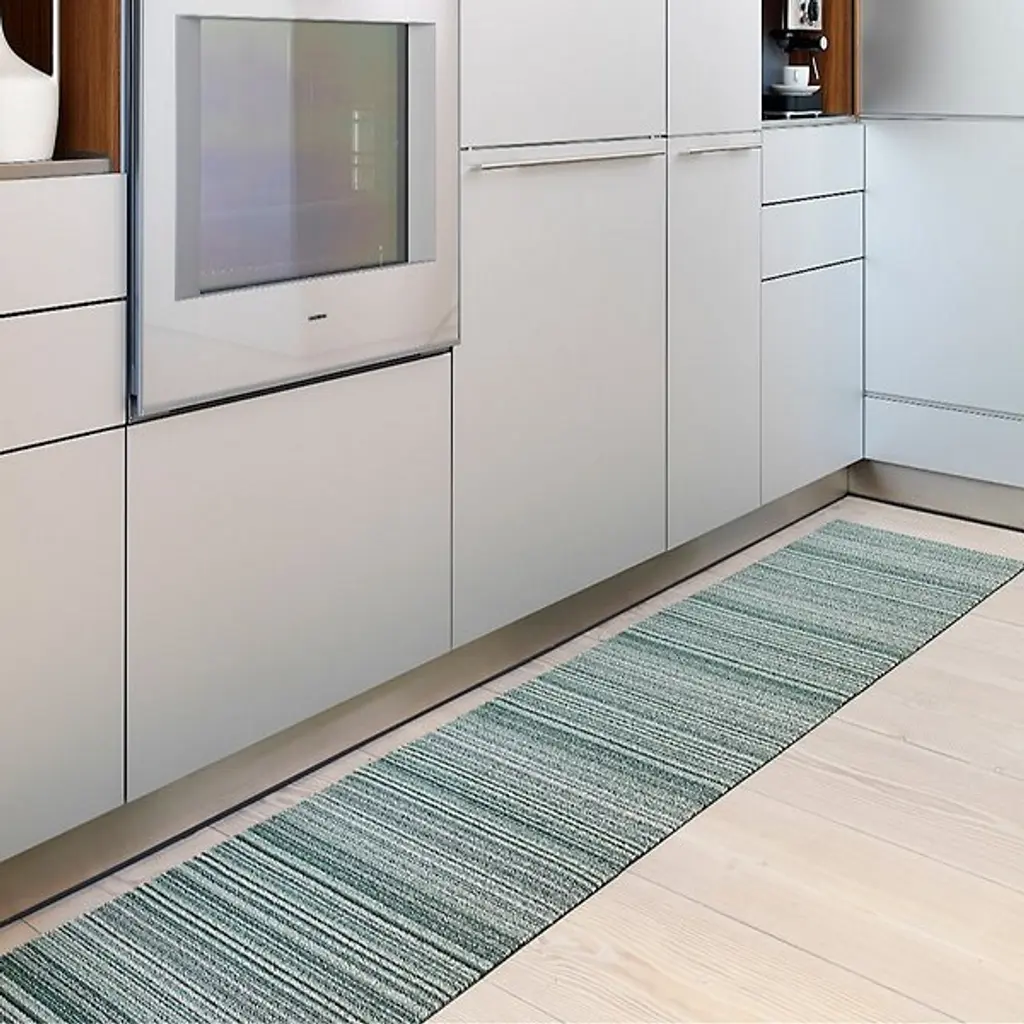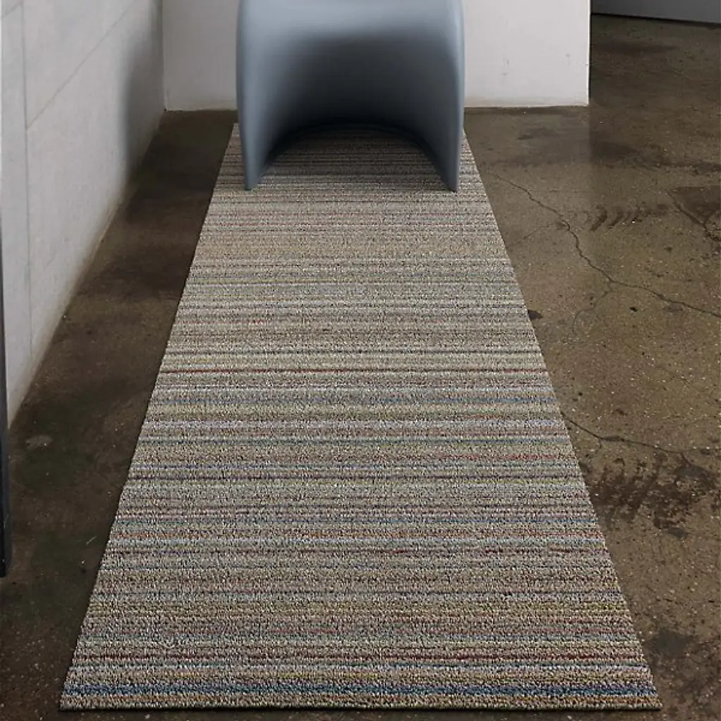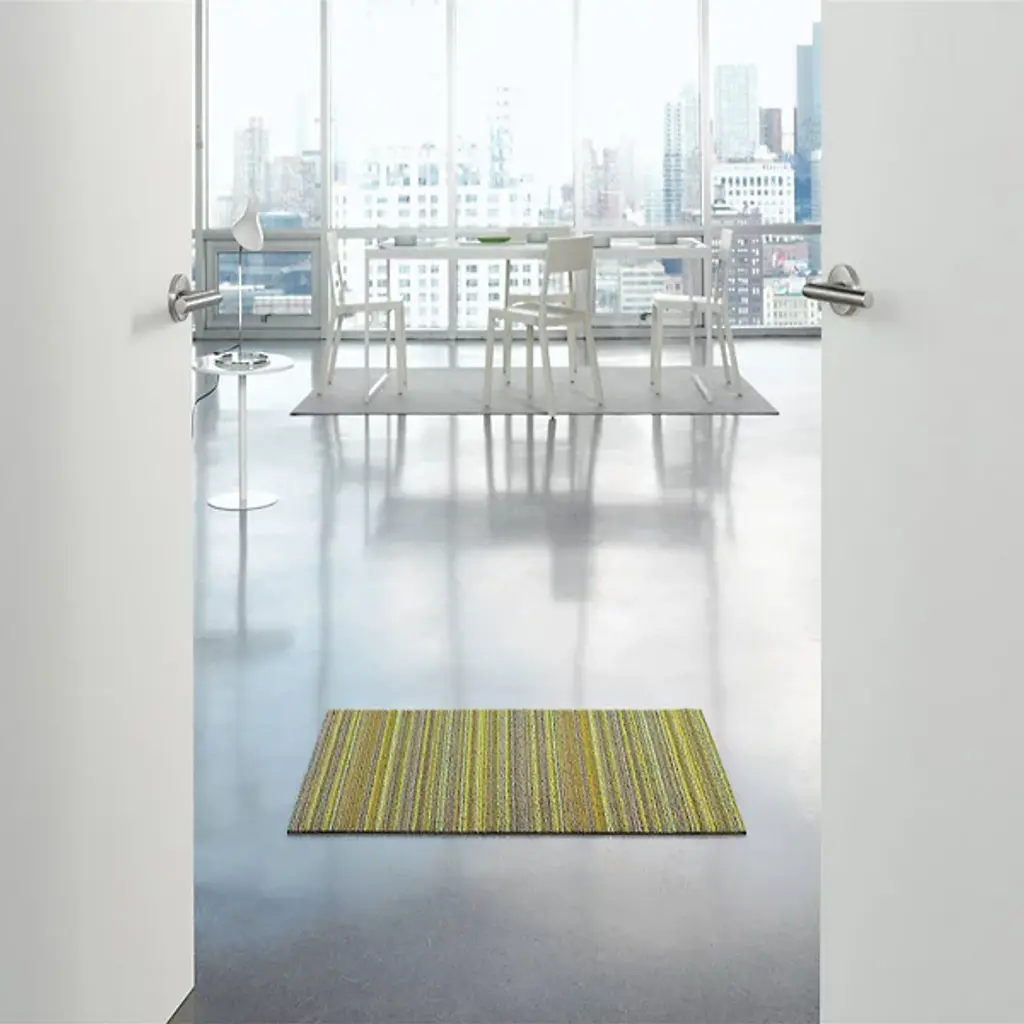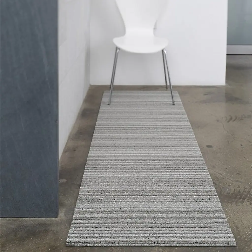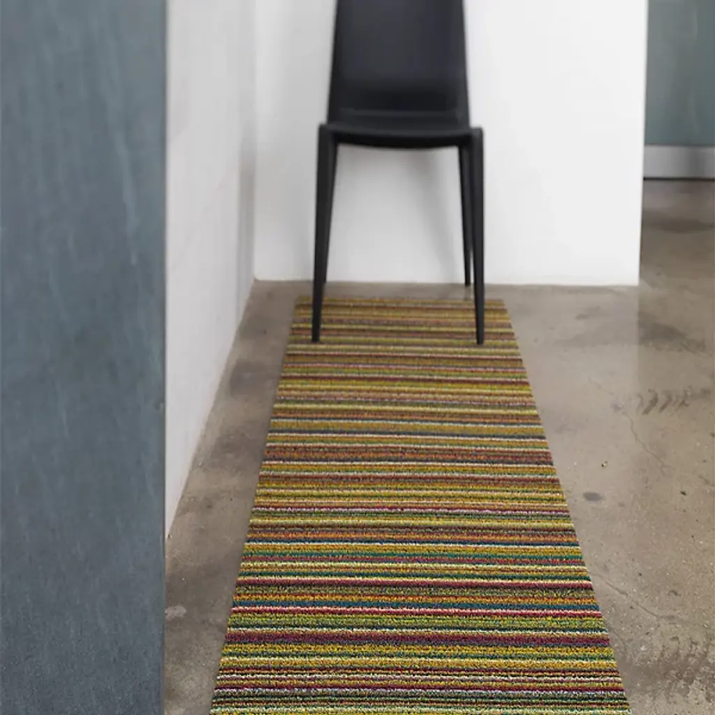 Quick to dry and mold and mildew resistant, the Chilewich Skinny Stripe Shag Indoor/Outdoor Mat is a great option for near showers and front and back doors. The rug is tufted from durable vinyl yarns to create its textured shag look. Made in the USA; designed by Sandy Chilewich.
