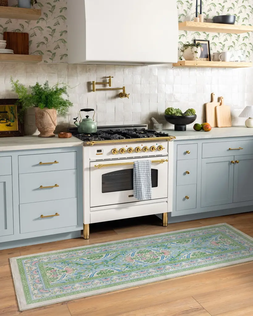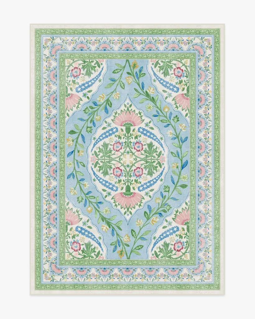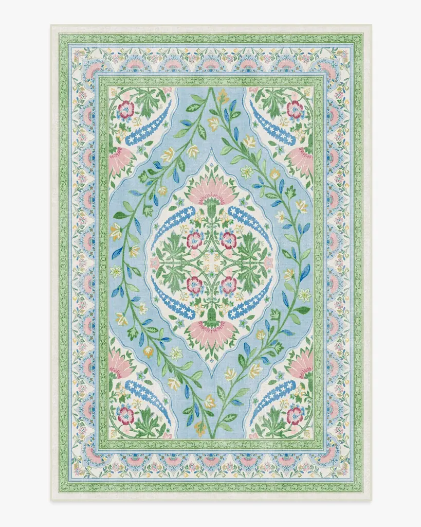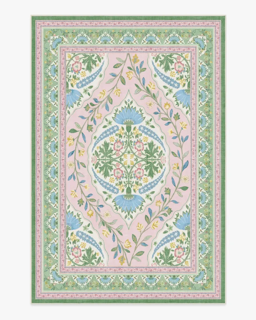 A unique blend of whimsical florals and traditional styling, this design showcases a central floral motif surrounded by delicate leaves and hints of flowers. Muted blue, pink, and green hues are highlighted with small yellow pops, creating a soft contrast against the warm beige ground. Water-resistant, stain-resistant, and machine-washable. Rug colors may vary slightly according to your device and the lighting in your space.