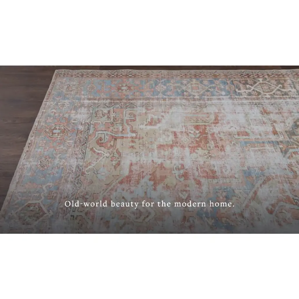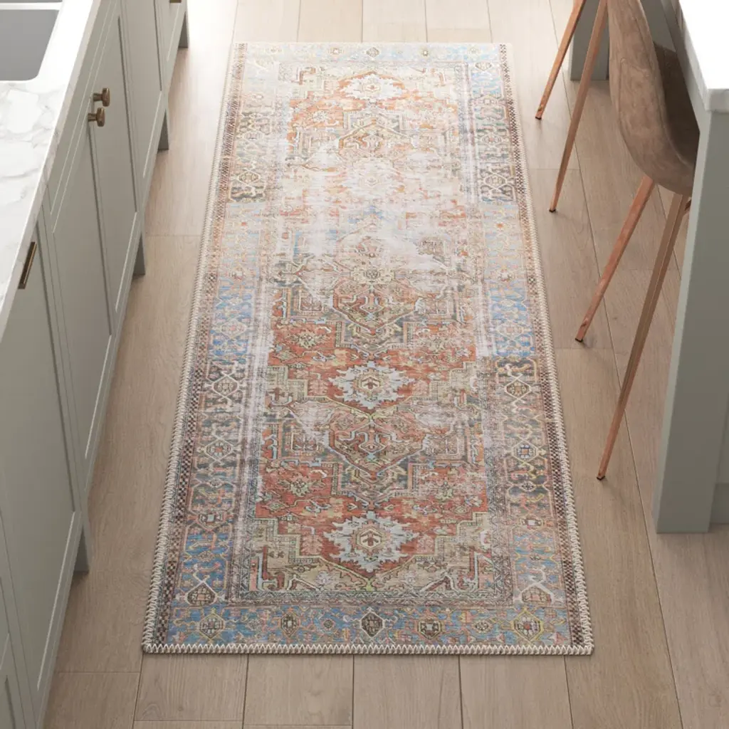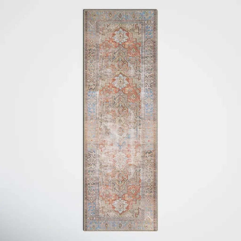 This area rug has the look of a coveted flea market find with its braided border and purposefully faded design. Power-loomed from polyester, it showcases a timeless central medallion pattern in terracotta, blue, and sage green hues. Plus, its stain-resistant material makes this rug a great choice for homes with children, and pets, and the low-pile stands up to busy areas like entryways and living rooms. To reduce shifting and sliding, we recommend adding a rug pad (sold separately) underneath.