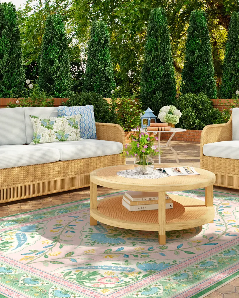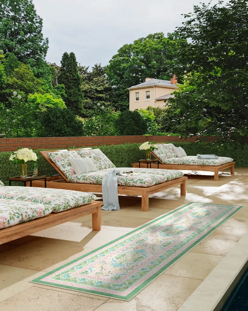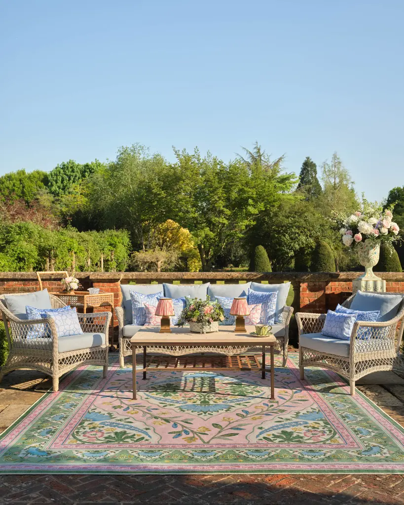 Bring the charm of whimsical and traditional design to your outdoor spaces. The central floral motif is surrounded by delicate leaves, flowers, and flowing vines for a refreshing take on Mrs. Alice’s classic Skye patterns. Subtle pops of yellow punctuate the muted hues of blues, pinks, and greens, all set against a warm beige background. The extra-durable, machine-washable material is perfect for both outdoor and indoor use, especially high-traffic areas and those exposed to the elements. Rug colors may vary slightly according to your device and the lighting in your space.
