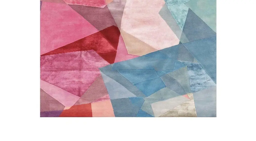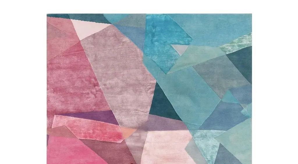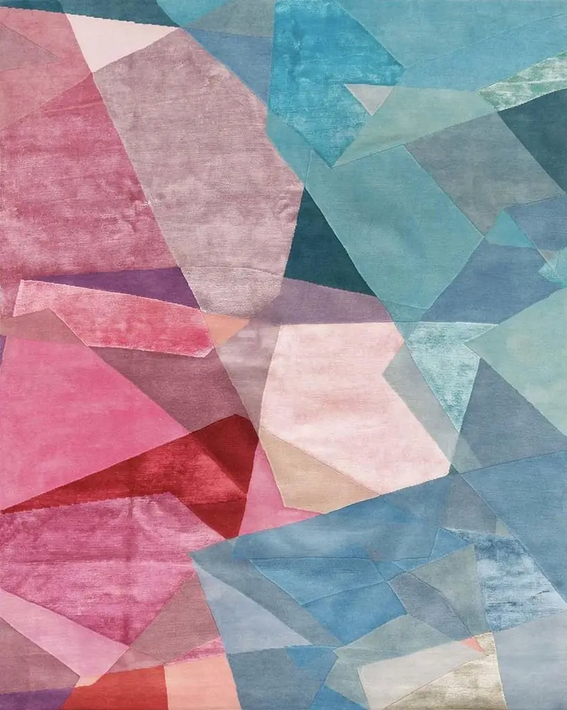 Part of the Design collection, this rug is hand-knotted in Nepal. It boasts a series of blue and pink prisms juxtaposing over a dark background, creating a design of strong visual impact. It features 50% silk and 50% Himalayan wool with 152,000 knot/sqm. The base is .05 cm high, the design is .07 cm high. This piece can be customized in dimension, color, and composition.