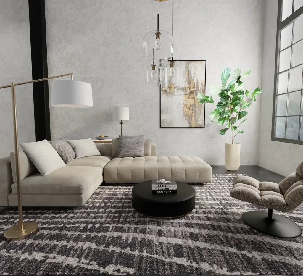 Collection: Skyview Colors: Black, Gray, Ivory Construction: Machine Made Material: Face: 100%Polypropylene / Warp: Cotton Pile: Medium Pile Pile Height: 1" Styles: Contemporary,Industrial,Bohemian & Eclectic Backing: Cotton Made In: Turkey Thickness: 1" Price Range: $$$$$ (Affordable)