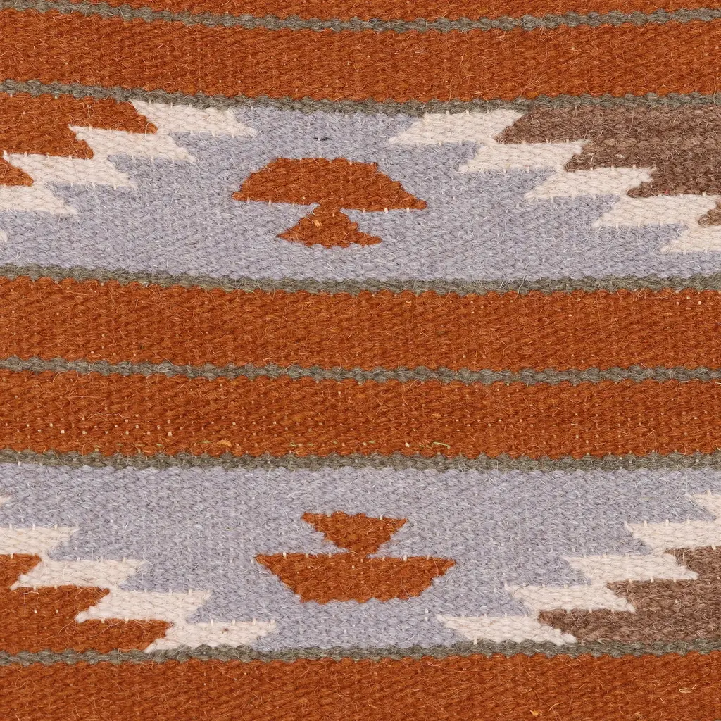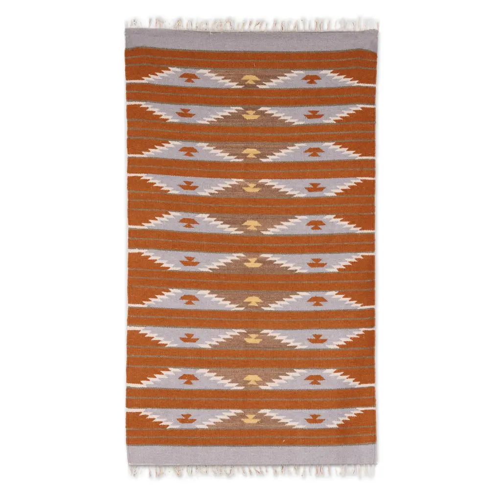 With geometric forms, waves of slate alternate with burnt orange stripes. Sonik Sethi presents this rug, which is handwoven from wool by Indian artisans. Dangling fringe accents each end of this rug.