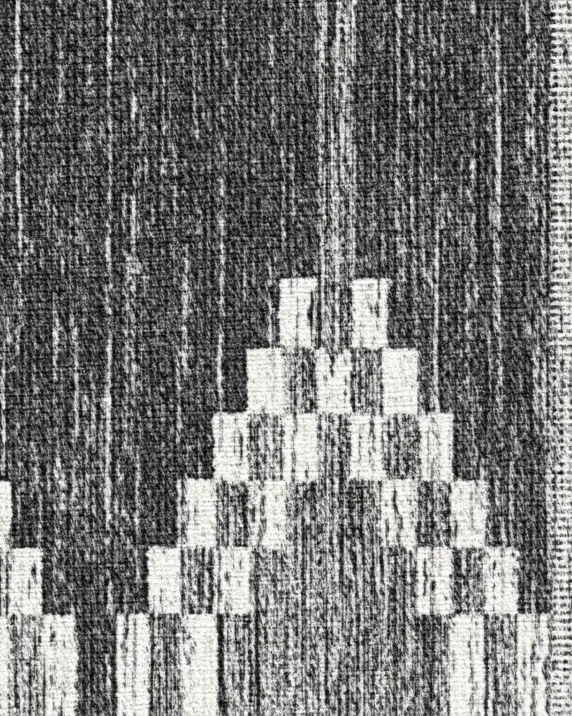 Inspired by a rustic hand loom, our Sloane Black Rug features an intriciate geometric design in tonal charcoals and greys complemented by soft cream accents. Water-resistant, stain-resistant, and machine-washable. Rug colors may vary slightly according to your device and the lighting in your space.