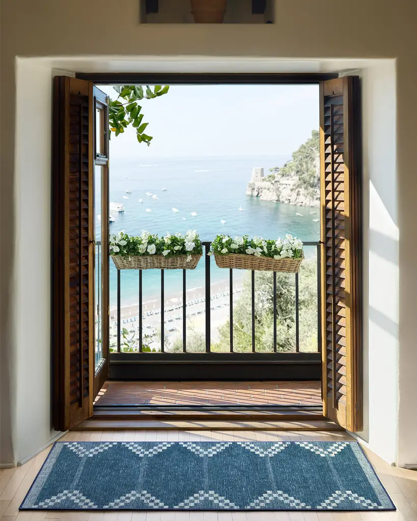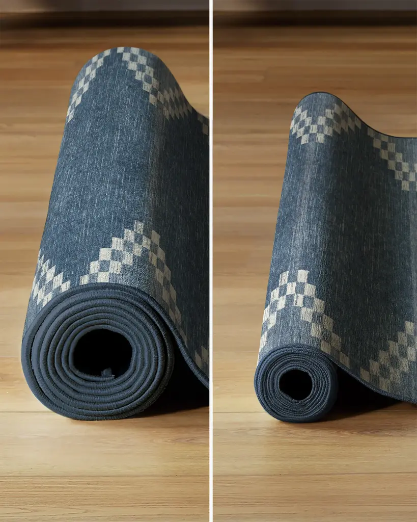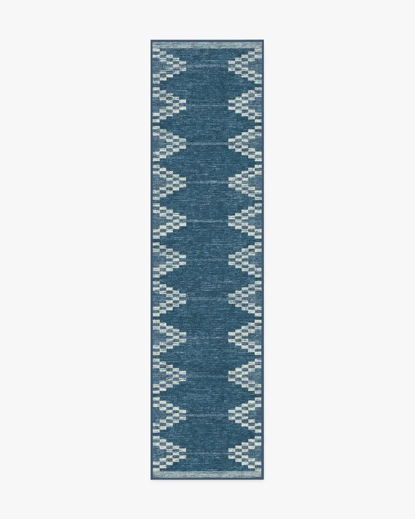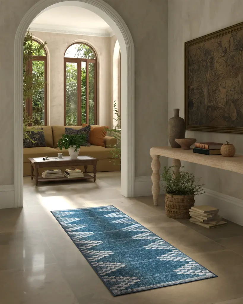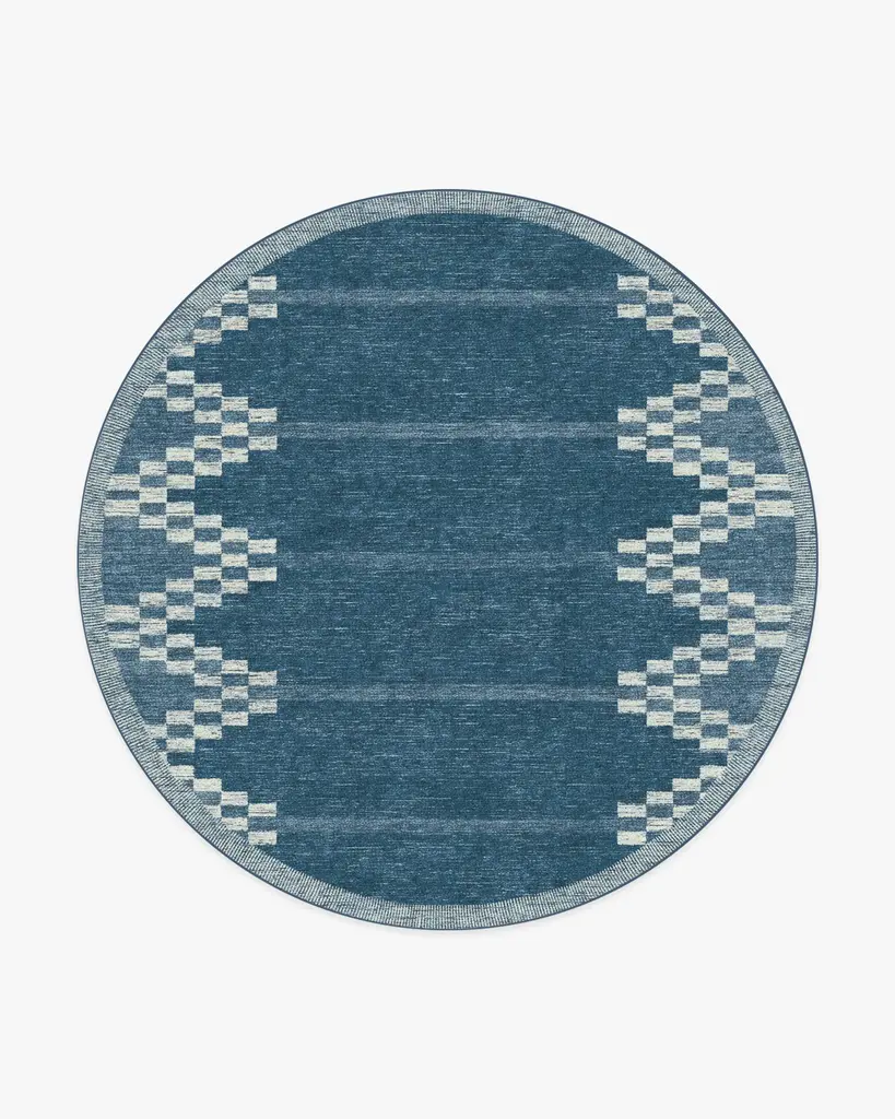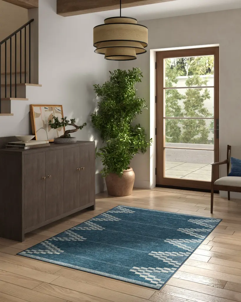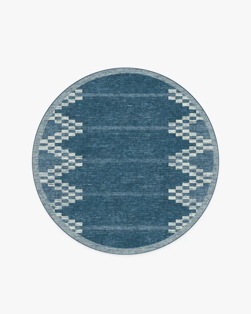 Inspired by a rustic hand loom, our Sloane Blue Rug features an intriciate geometric design in tonal blues complemented by soft cream accents. Water-resistant, stain-resistant, and machine-washable. Rug colors may vary slightly according to your device and the lighting in your space.