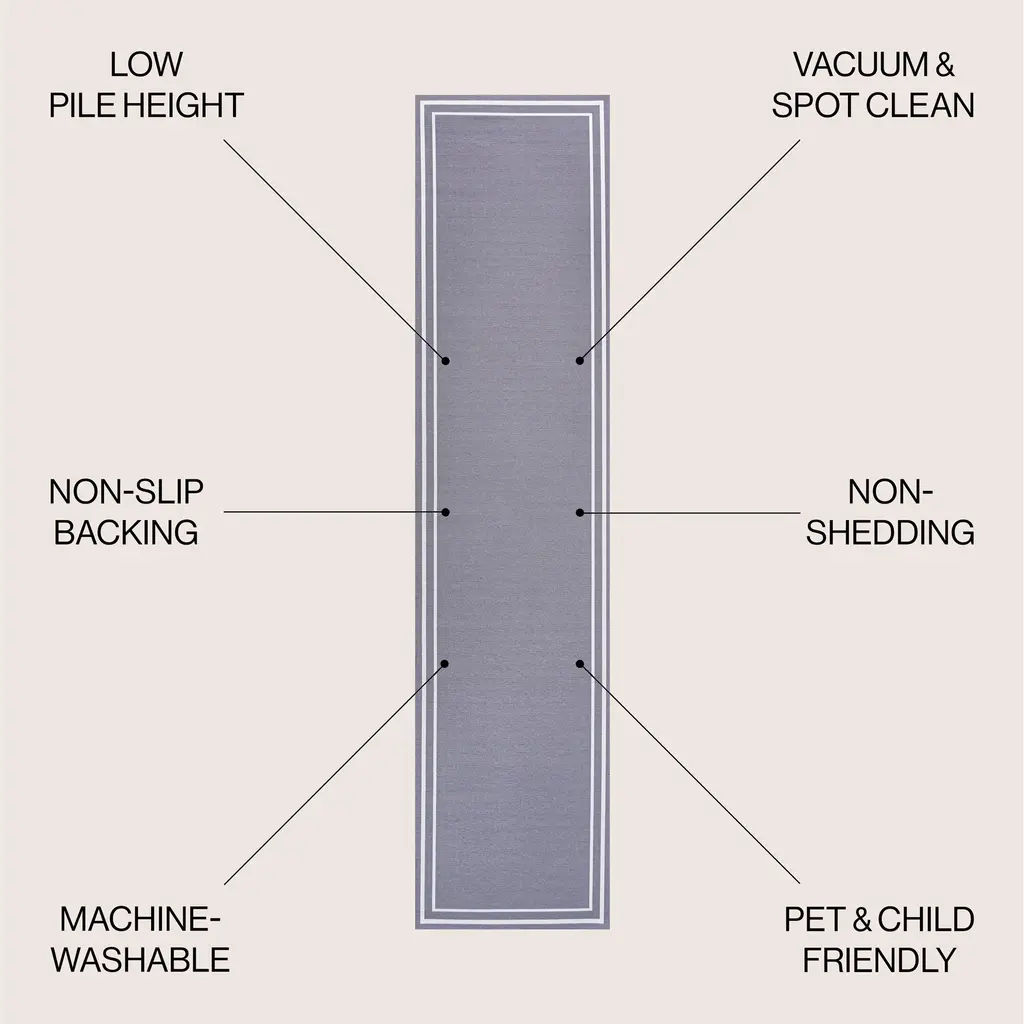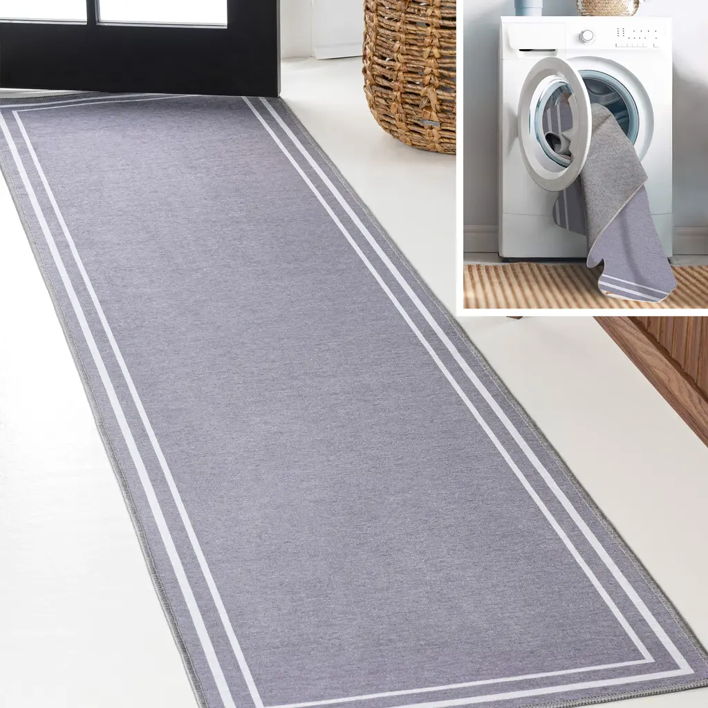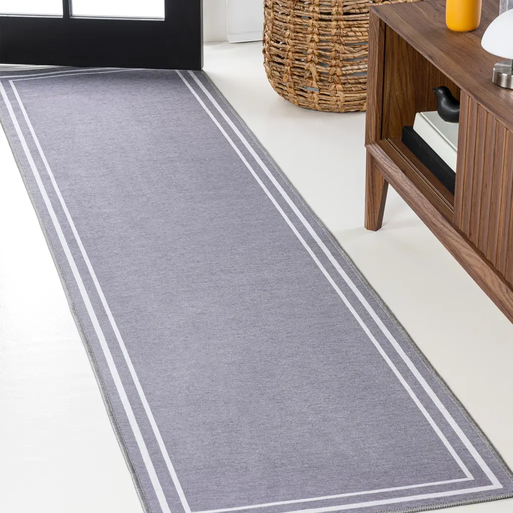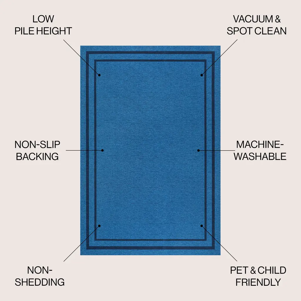 Our classic rug has a traditional striped border with a plain center field. It's woven from durable synthetic fibers with a plush chenille texture and cotton backing. This easy-care, washable rug is great for high traffic spaces like a living room, dining room or entry.
