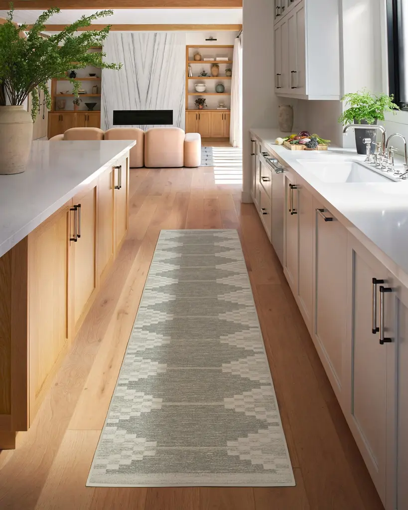 It's all in the details. Our Sloane Grey Rug features a creative geometric design with wide, ivory chevron borders against a neutral grey background, all inspired by a rustic hand loom. Water-resistant, stain-resistant, and machine-washable. Rug colors may vary slightly according to your device and the lighting in your space.