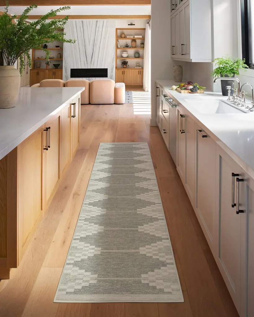It's all in the details. Our Sloane Grey Rug features a creative geometric design with wide, ivory chevron borders against a neutral grey background - all inspired by a rustic hand loom. Water-resistant, stain-resistant, and machine-washable. Rug colors may vary slightly according to your device and the lighting in your space.