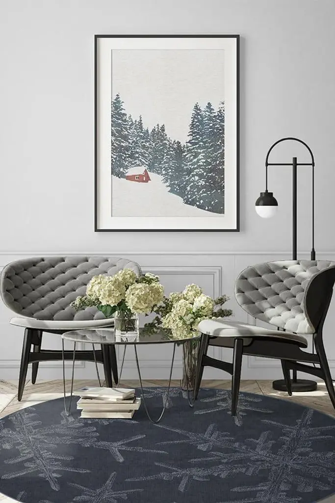 Make a merry and memorable statement with our Snowflake Navy Rug, showcasing a festive snow flurry motif in an elegant color palette of mountain mist and crystal breeze on a slate blue blended background. Water-resistant, stain-resistant, and machine-washable.