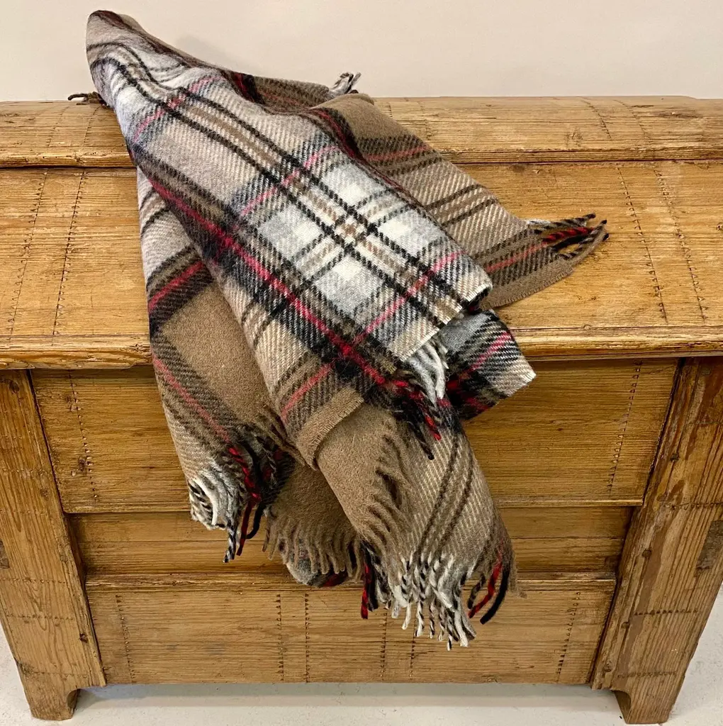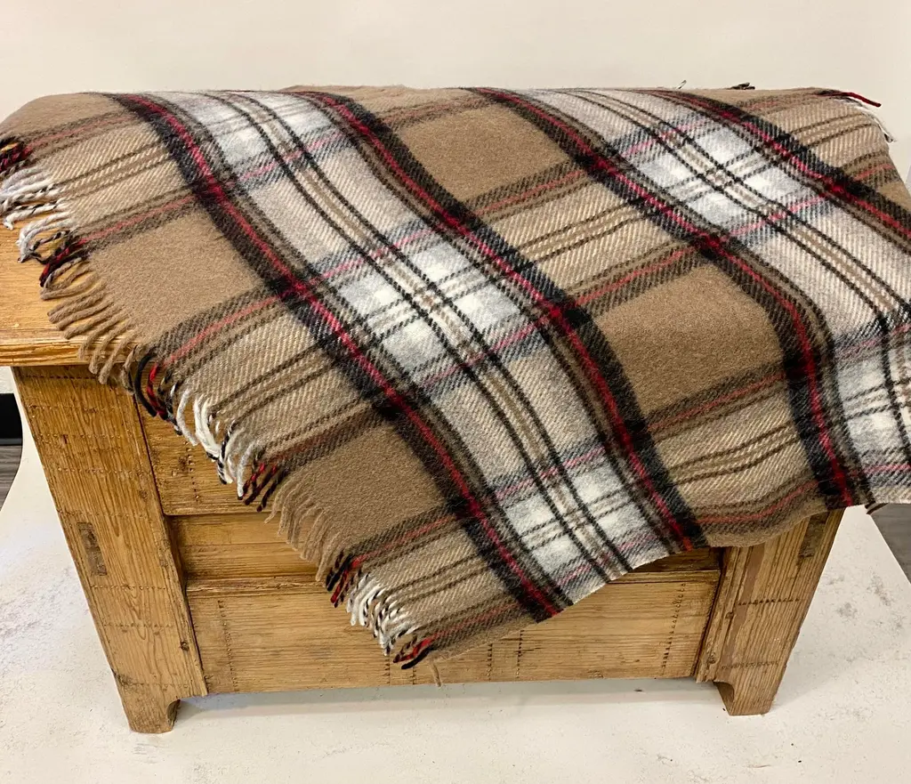 Soft Merino Lambswool Knee Rug / Blanket In A Classic Tan Burberry-Like Tartan Plaid Pattern - Made In England