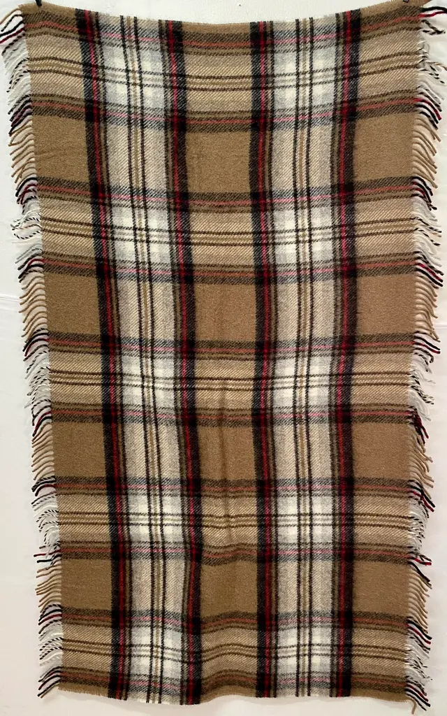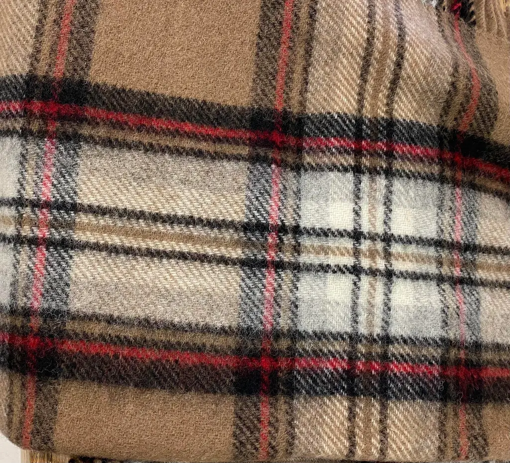 Super Soft Merino Lambswool Knee Rug/Blanket In A Tan Burberry-Like Tartan Plaid Pattern- Made In England. Our knee blankets are cut to a smaller size then a traditional throw which is perfect for laying across your knees, dressing furniture, wrapping around your shoulders and bringing along as a travel blanket. Established in 1837 with over 180 years of proud British manufacturing & design heritage already to our name, They are one of Great Britain’s last remaining vertical woolen mills. The term ‘vertical’ is a throwback to the Victorian era when mills would rise several stories, with each floor containing separate parts of the manufacturing process. Today it remains a unique confirmation of our authenticity; we control every stage of production from raw wool to finished product including Dyeing, Blending, Carding, Spinning, Warping, Weaving, and Finishing. They create their products with a balance between innovative design & traditional craft, maintaining their position at the forefront of commercial trends with consistent high quality. Perfect for a wedding gift or a birthday gift. Can also be worn over the shoulders or used to dress a piece of furniture. Size = Approx 54 inches x 29 inches, not including the fringe. Dry clean.