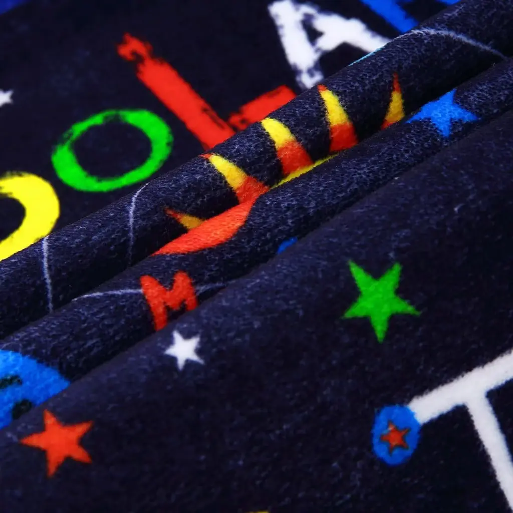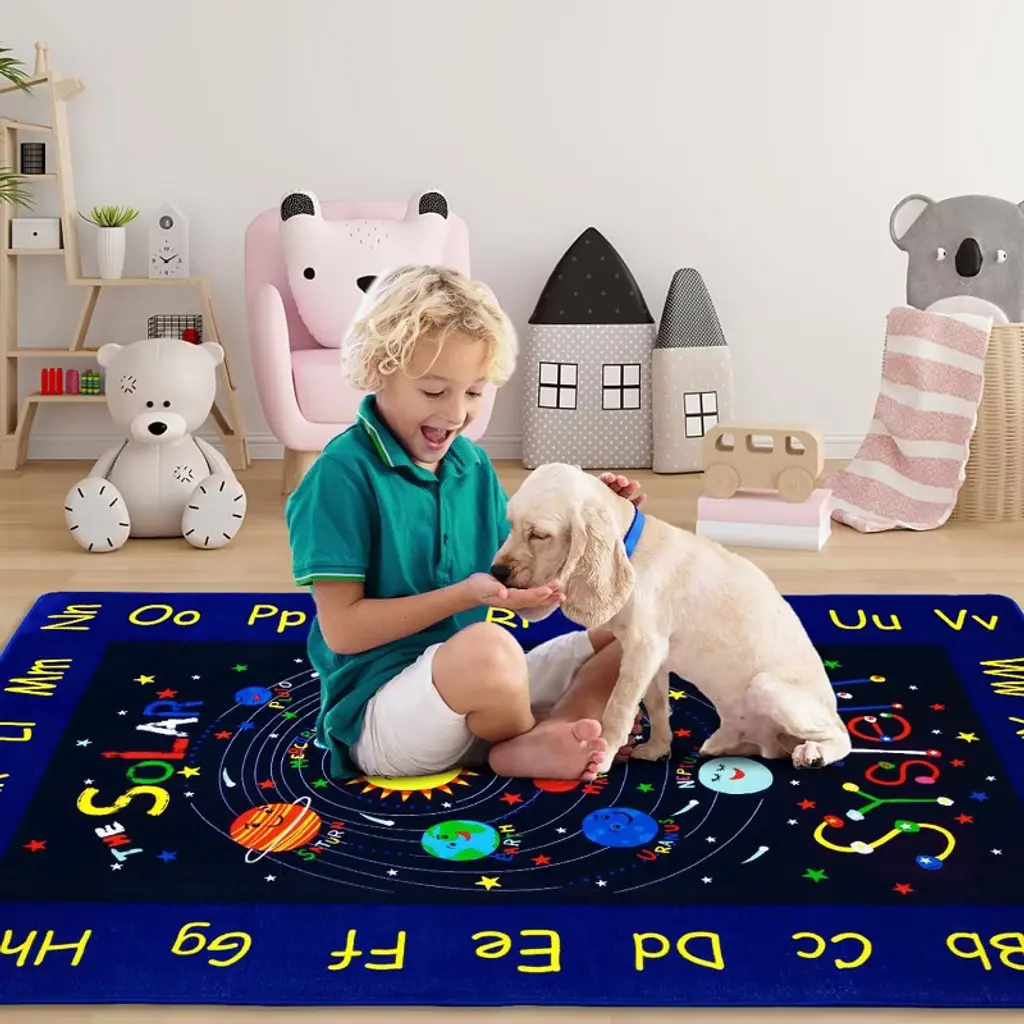 Ideal for the home with its versatile design and efficient finishing, this Galaxy rug is made from 100% polyester to provide an ultra-soft, skin-friendly surface that ensures comfort and safety for children's delicate skin and is perfect for creating a warm and cozy play environment. Featuring a charming solar system design combined with an ABC alphabet pattern, this outer space rug is both educational and ideal for decorating a playroom, nursery or as a photo prop, making learning fun and engaging. Thousands of non-slip rubberized dots on the bottom ensure that the rug stays firmly in place, providing a safe play area for active toddlers, and you can rest assured that it prevents slipping or sliding, ensuring safe playtime. Maintaining this children's play rug is easy and convenient with regular vacuuming and spot cleaning with a mild detergent or carpet cleaner, and its durable construction resists shedding and maintains its vibrant colors and designs to ensure long-lasting use. Perfectly suited for children's rooms, playrooms, classrooms, nurseries, or bedrooms, this space-themed rug is a practical and decorative choice that makes a thoughtful gift for birthdays, holidays, or special occasions, adding style and functionality to any children's space. Functional in design and aesthetic in presentation, this rug offers both efficiency and flexibility, making it ideal for everyday use.