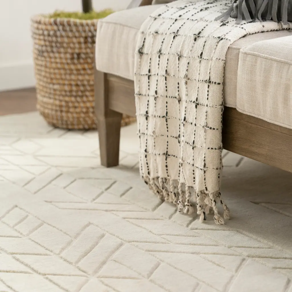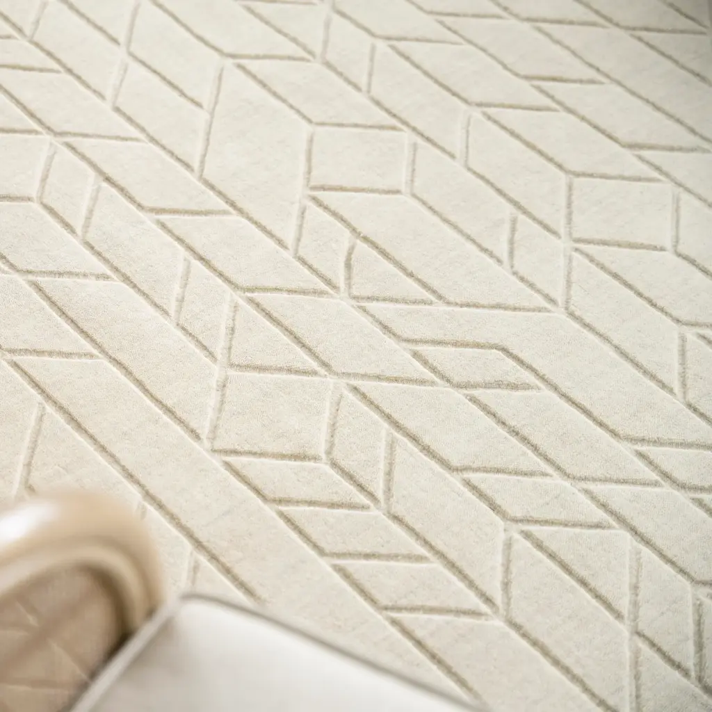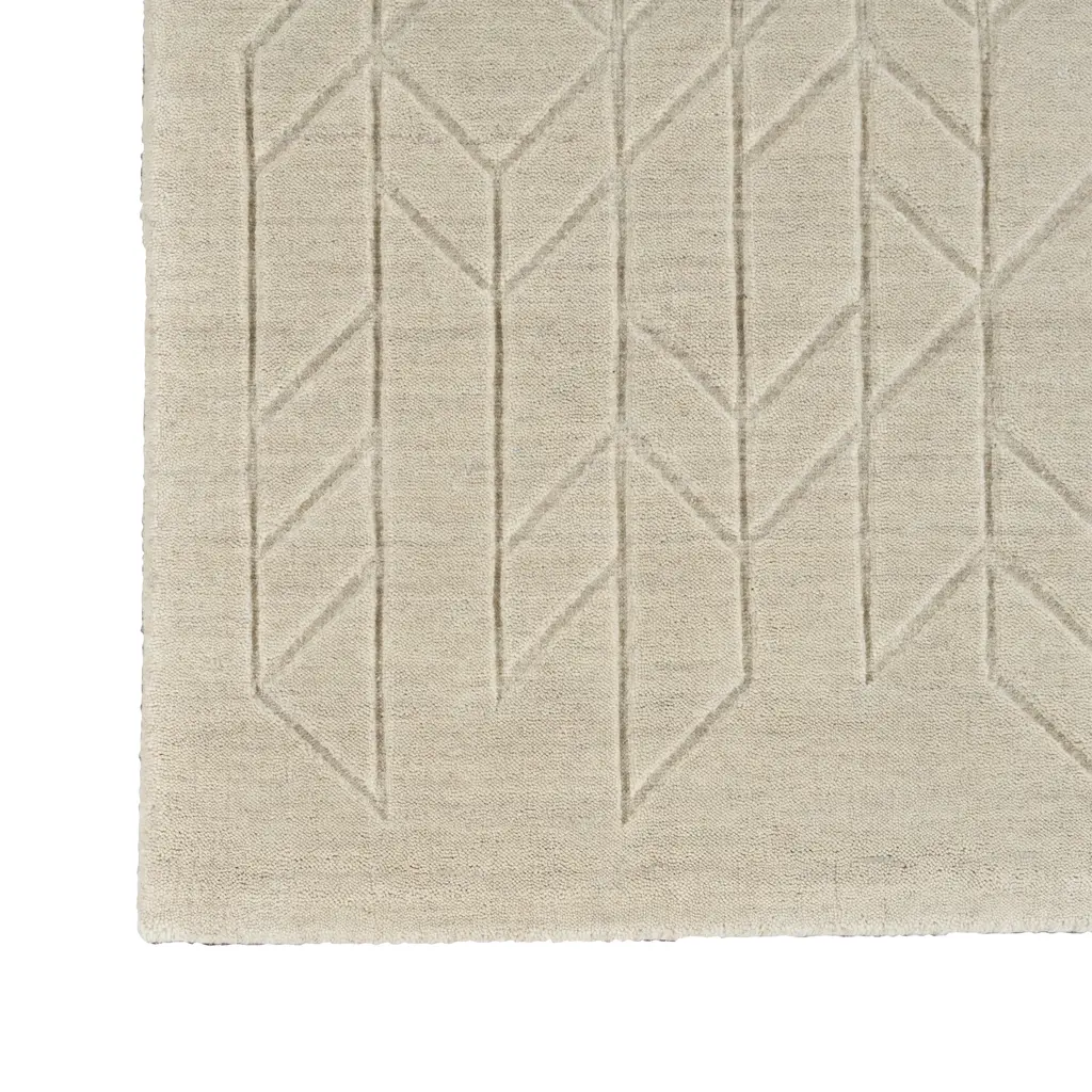 The Solid Essentials Wool Rug from the Rug Essentials collection provides a foundation of comfort and contemporary style. Measuring 7'9" x 9'9", this area rug is designed to define larger spaces such as living rooms, dining areas, or master bedrooms. Crafted in India from 100% European Wool, the rug features a durable, soft pile. Its beige color offers a neutral base adaptable to diverse interior palettes. A subtle, carved geometric pattern is integrated across the surface, creating textural depth with interconnected abstract shapes. This design element adds visual interest while maintaining an understated aesthetic. Wool, as a natural fiber, offers inherent benefits including resilience, natural stain resistance, and sound-absorbing properties. This makes the Solid Essentials Wool Rug a functional and stylish addition, enhancing warmth and comfort in a variety of home settings.