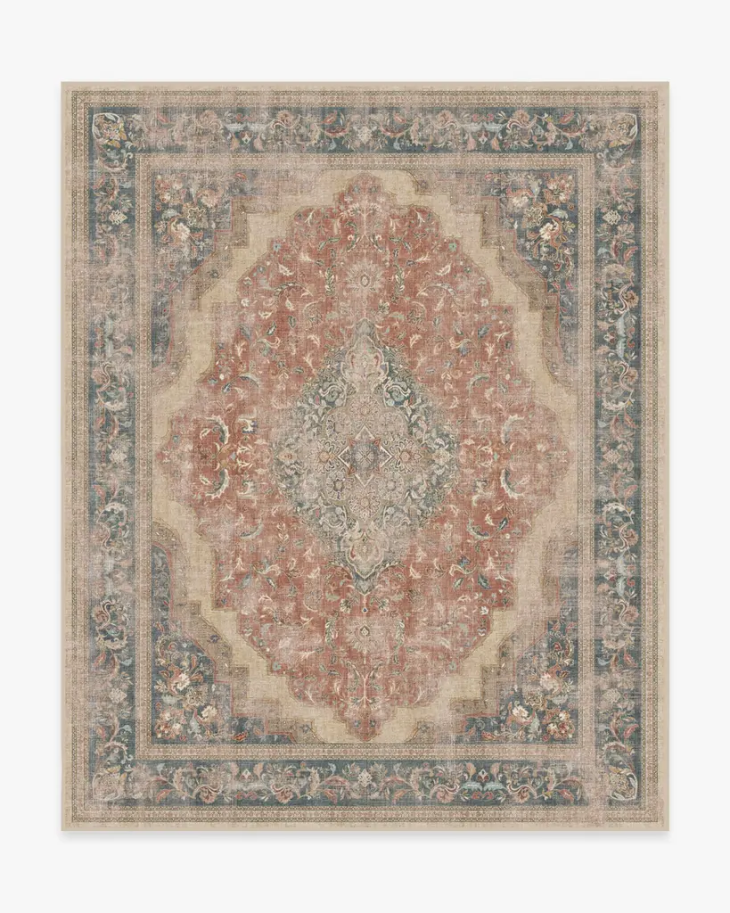 As if it has been in the family for generations, the Soluna Gold & Teal Rug evokes a sun-faded, timeworn richness. Inspired by Turkish rugs, this piece features a large, central hexagonal medallion alongside subtle geometric florals across the surface for a defining look and feel. All brought together in hues of wheat gold, clay, and antique teal blue. Water-resistant, stain-resistant, and machine-washable. Colors may vary by device and lighting.