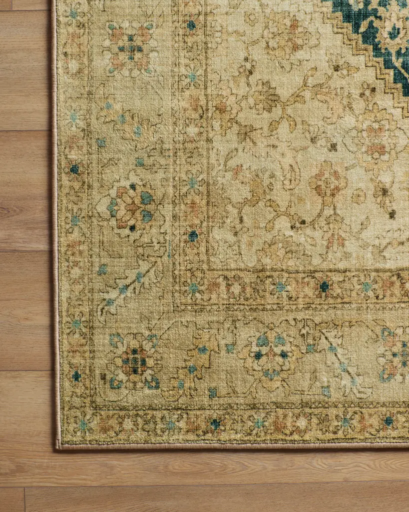 As if it has been in the family for generations, the Soluna Gold & Teal Rug evokes a sun-faded, timeworn richness. Inspired by Turkish rugs, this piece features a large, central hexagonal medallion alongside subtle geometric florals across the surface for a defining look and feel. All brought together in hues of wheat gold, clay, and antique teal blue. Water-resistant, stain-resistant, and machine-washable. Colors may vary by device and lighting.