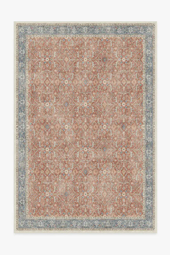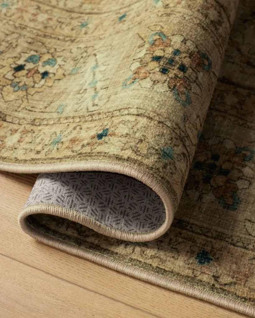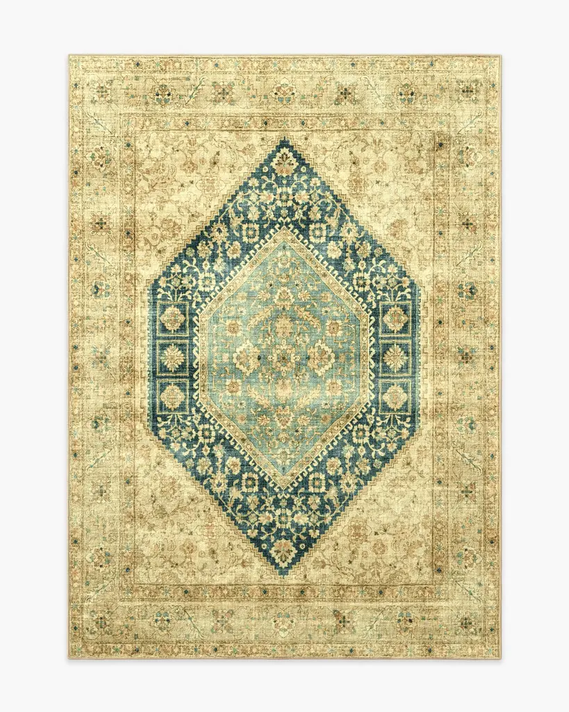 As if it has been in the family for generations, the Soluna Gold & Teal Rug evokes a sun-faded, timeworn richness. Inspired by Turkish rugs, this piece features a large, central hexagonal medallion alongside subtle geometric florals across the surface for a defining look and feel. All brought together in hues of wheat gold, clay, and antique teal blue. Water-resistant, stain-resistant, and machine-washable. Colors may vary by device and lighting.