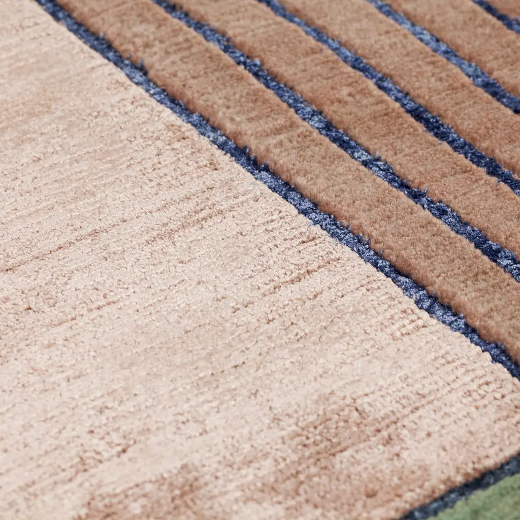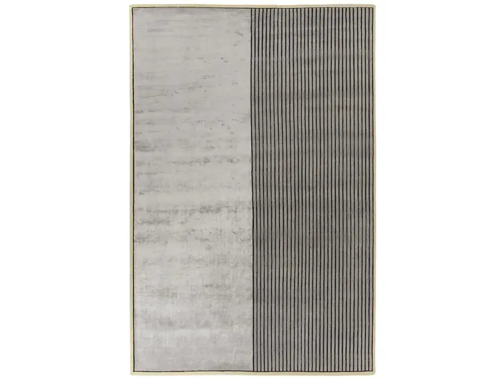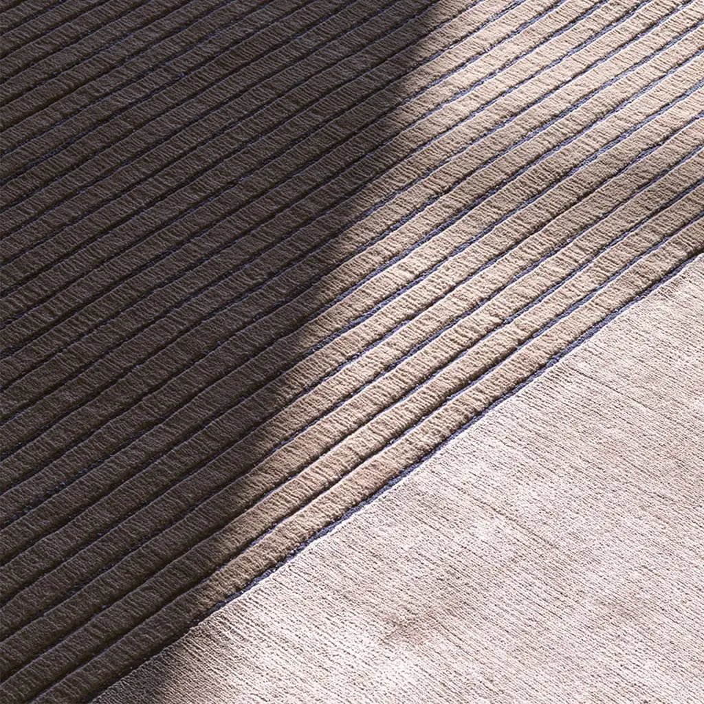 The Sombra collection, designed by Miguel Reguero, celebrates the encounter between architecture and nature. The rational and linear geometry in contrast with the free arrangement of the material and the alternation between viscose and wool underline the craftsmanship necessary to make these exceptionally stylish and original carpets so unique. Hand-knotted rug, with a pile composed of wool and viscose.