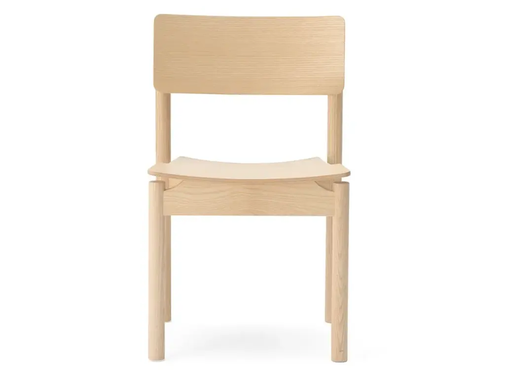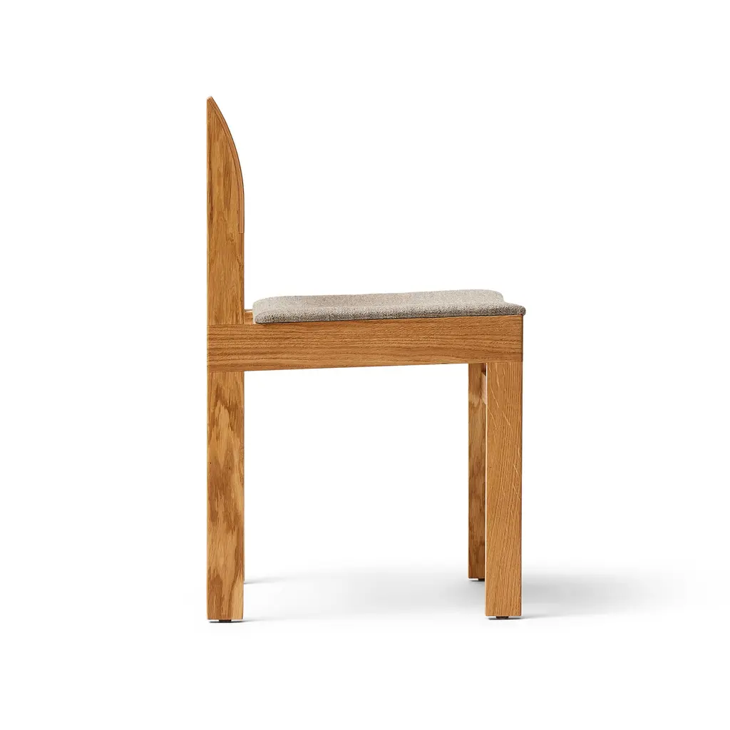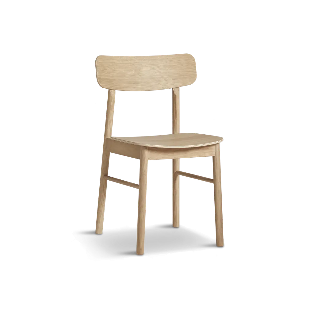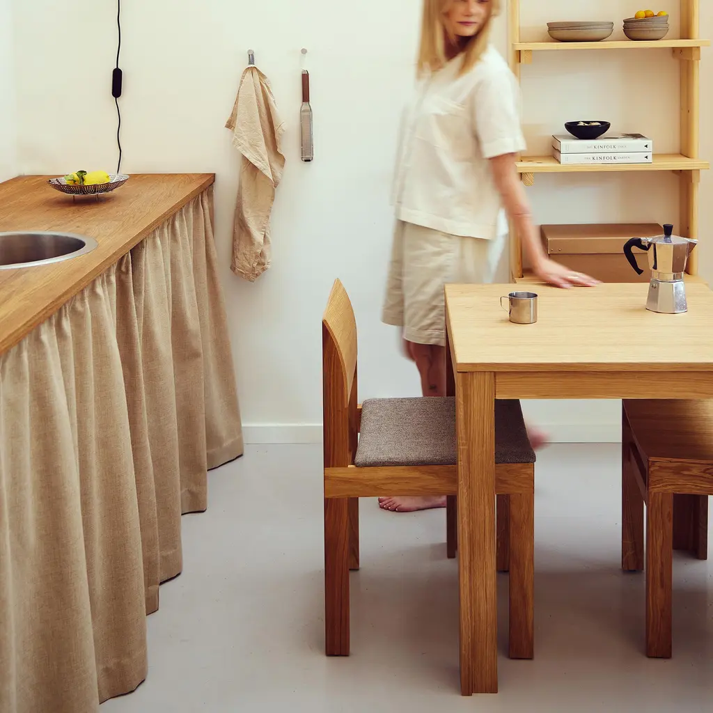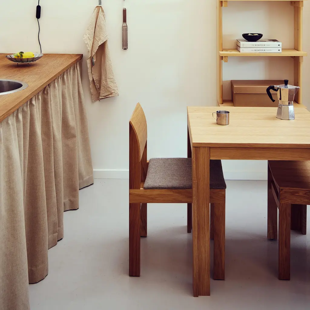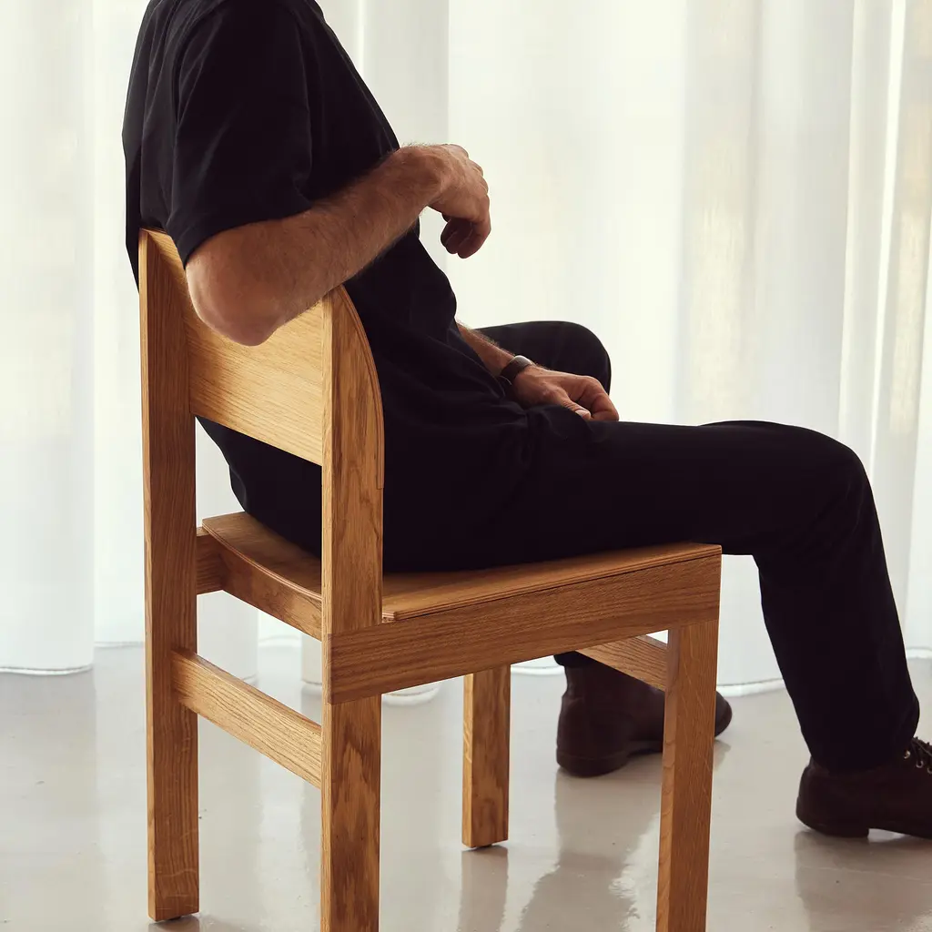 First lean tells you enough—the long back catches and your shoulders relax. Calm posture. Designed by Herman Studio for Form & Refine, Sonder uses FSC® European oak with molded veneer curves. Square legs and crossbars keep the structure frank; the U‑shaped seat spreads weight so the front edge doesn’t bite—one of those details you feel right away. Two choices, same silhouette: an all‑oak seat at 12.7 lb, or a Hallingdal 65 wool‑viscose upholstered seat over fire‑retardant foam at 13.4 lb. Seat height sits in the standard range—17.7″ or 45.0 cm (wood) and 18.1″ or 46.0 cm (upholstered)—so it slides under most dining and work tables without drama. At home it rotates from breakfast to laptops; in hospitality it shrugs off daily knocks. The natural‑oil finish lets the oak pick up a quiet patina. Care is simple: dry cotton cloth for daily wipe‑downs; mild soap if needed—no abrasives.
