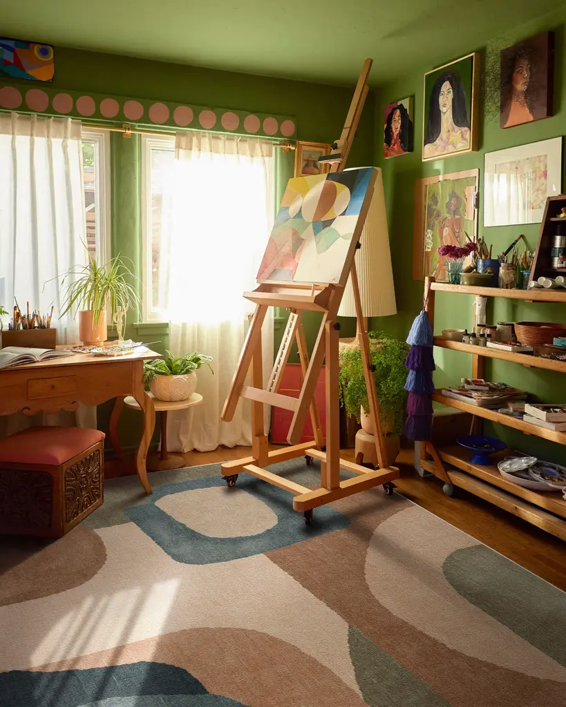 Decorate wild with our Justina Blakeney Sonia Sand & Ocean Rug. Inspired by Justina's original painting, "Tomorrow," this Orphism-like design features Justina's hand-painted geometric shapes playfully intertwined. The color palette seamlessly blends warm neutrals and creams with and cool blues and soft sage greens. Water-resistant, stain-resistant, and machine-washable. Rug colors may vary slightly according to your device and the lighting in your space.