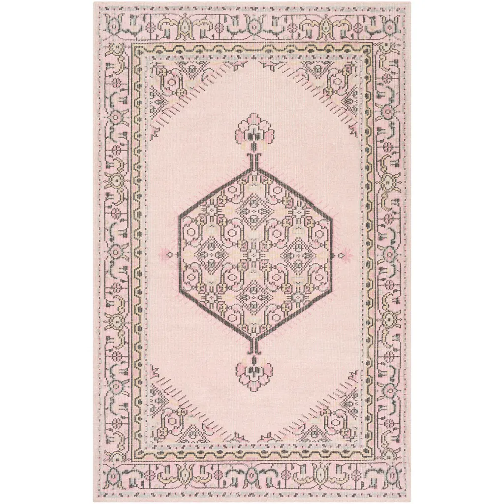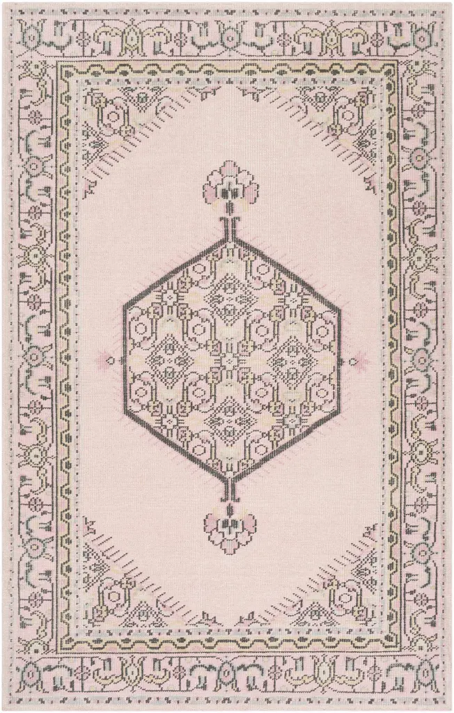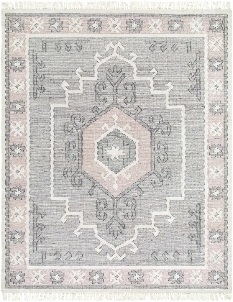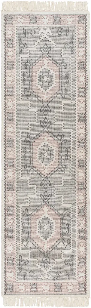Collection: Sosa Colors: Charcoal, Cream, Light Gray, Dusty Pink Construction: Hand Woven Material: 100% Recycled PET Yarn Pile: No Pile Styles: Traditional Made In: India Thickness: 0.16" Fringe Length: 3" Price Range: $$$$$ (Affordable)