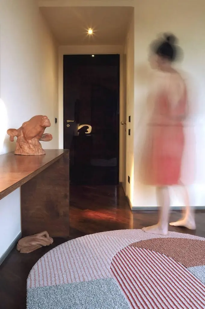 Sottoportico rug by Seraina Lareida.Dimensions: W 300 x H 390 cm. Materials: 100% New Zeland top-quality wool.Available in sizes: Medium (150 x 200cm), and Large (200 x 260cm). Customizable sizes are available. Please contact us for more information. This rug is inspired by the porches distroied by the water in Venice, an harmony of overlapping Venetian architecture and the colors palette typical of the place, transformed by the salt of the Venetian Lagoon.Walking on you can feel the different length and different way used to make it. Made with the tafting technique, have been used 100% New Zeland top quality wool. Yearns and manufacture are certificate as handcrafted exclusively in the Italian atelier. Sottoportico bringh you an concentration of Venice to your house. /Sot-to-pòr-ti-co/ means ‘under the porch’. Sottoportico is a characteristic architecture widespread in Venice city, cause the little space available on the land. But is also very comfortable to be protected from bad weather, as most of the people can move only by walking, otherwise by boat.SERAINA LAREIDAPortrait Seraina Lareida is a young Swiss designer currently based in Bern/Switzerland.After one year of living and working in London, she returned to Switzerland in order to accomplish her MA in Product Design at the ECAL in Lausanne. Ever since, she has been exhibiting her work at renowned places like Design Miami Basel, Bikini Berlin, Maison&Objet Paris, ISPO Munich, Salone Internazionale del Mobile Milan and Musée de Design et d’Arts Appliqués Contemporains Lausanne. Currently, she is working in the product development department of USM Möbelbausysteme, a Swiss leader for interior and office furniture. She is also initiating her own projects in collaboration with local manufacturers, design labels, and art galleries.