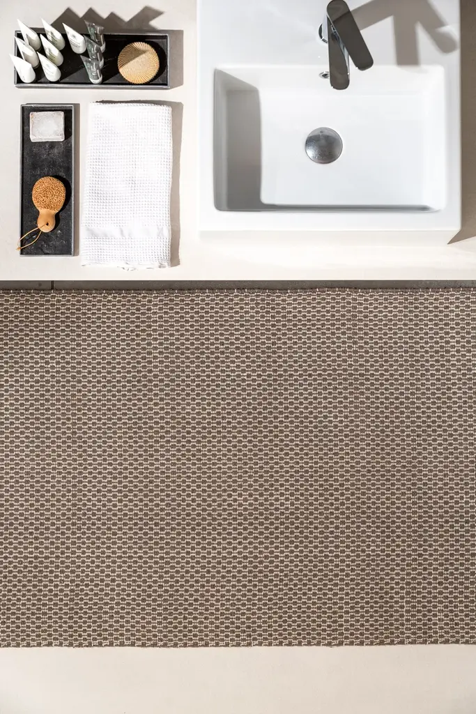 In Warli we have been raised with certain values and by taking care of our surroundings. Our mission is that everything we do is made for a culture of sustainability. Design, communication and production are fed by the conviction that making fair and more sustainable products is of great importance and must not be postponed. This is Warli, a re-evolution that we need to share, regardless of gender, nationality or previous habits of those who choose us. With the K&B collection rather than contributing to global consumption of plastic, we have removed 100 PET bottles from the seas, fields and roads for every square meter of carpet we produce. The yarn we use for these bath & kitchen rugs is 100% recycled, washable, stain-resistant, self extinguishing and non slip treated. Colori BR|B (brown | burgundy) CR|LG (cream | light grey) CR|TL (cream | teal) TT|GG (taupe | green grey) Technical information Quality: Handwoven "dhurrie" rug, 100% recycled PET yarn. Thickness: 4 mm approx. Weight: 1,5 Kg/sqm approx.