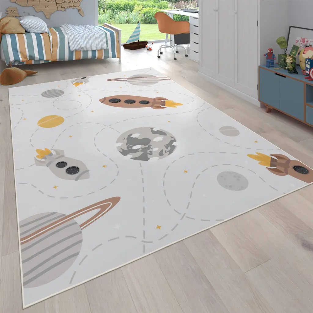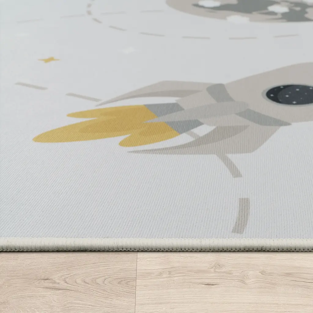 For little adventurers who treasure a plush landing on their cosmic escapades, our chic short pile rugs launch them into a galaxy of play. Choose from pale cream or sleek grey to seamlessly accentuate modern décor and harmonize with your furnishings. These rugs, adorned with whimsical stars, planets, and spacecraft, ignite young imaginations, and create a nurturing space for playful growth. Designed to endure the spirited activity of a child's room without losing their charm, these rugs are woven from durable synthetic fibers, ensuring long-lasting softness and vibrancy. They're not only tough against wear and tear but also a breeze to maintain. Prioritizing your child's well-being, our rugs meet the rigorous STANDARD 100 by OEKO-TEX, certifying they're safe from harmful substances. This means worry-free playtime on a rug that's as beneficial for your child's adventures as it is for their health.