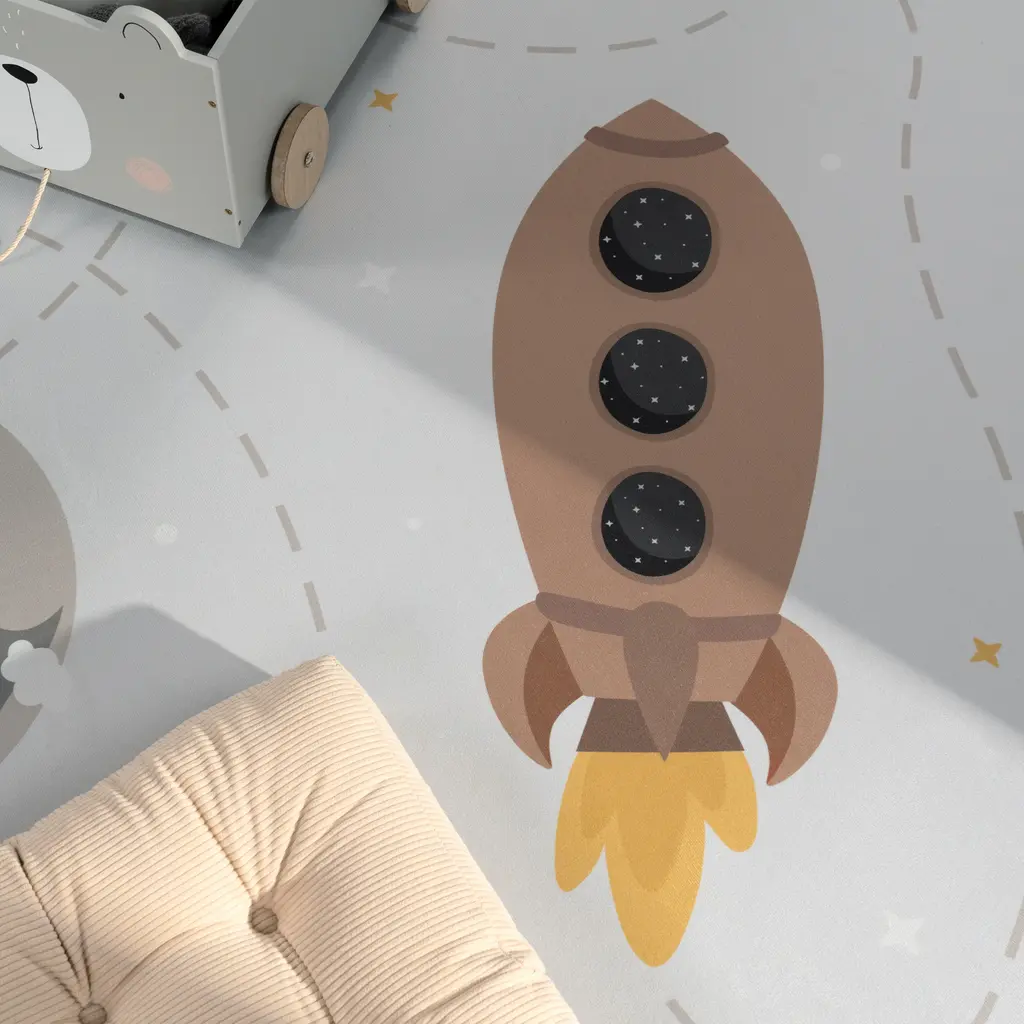 For little adventurers who treasure a plush landing on their cosmic escapades, our chic short pile rugs launch them into a galaxy of play. Choose from pale cream or sleek grey to seamlessly accentuate modern décor and harmonize with your furnishings. These rugs, adorned with whimsical stars, planets, and spacecraft, ignite young imaginations, and create a nurturing space for playful growth. Designed to endure the spirited activity of a child's room without losing their charm, these rugs are woven from durable synthetic fibers, ensuring long-lasting softness and vibrancy. They're not only tough against wear and tear but also a breeze to maintain. Prioritizing your child's well-being, our rugs meet the rigorous STANDARD 100 by OEKO-TEX, certifying they're safe from harmful substances. This means worry-free playtime on a rug that's as beneficial for your child's adventures as it is for their health.