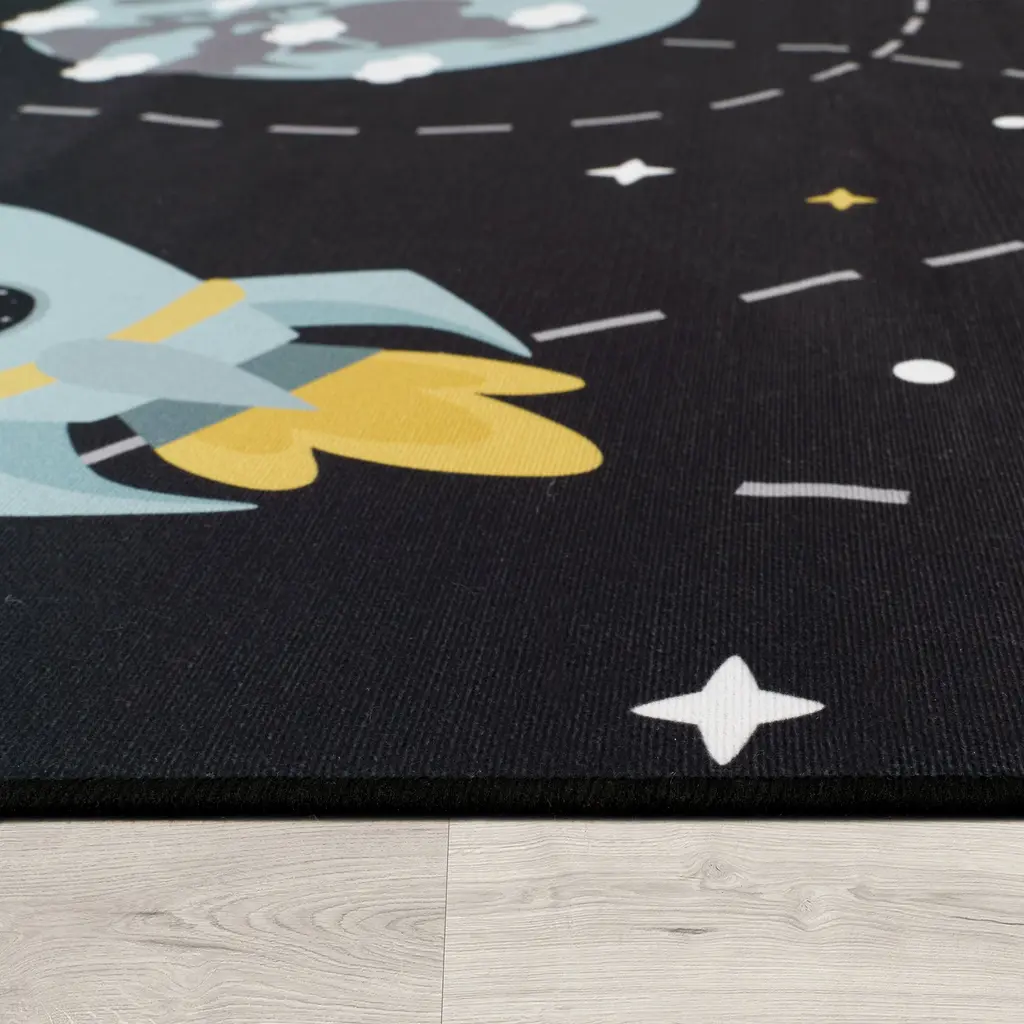 For little adventurers who treasure a plush landing on their cosmic escapades, our chic short pile rugs launch them into a galaxy of play. Choose from pale cream or sleek grey to seamlessly accentuate modern décor and harmonize with your furnishings. These rugs, adorned with whimsical stars, planets, and spacecraft, ignite young imaginations, and create a nurturing space for playful growth. Designed to endure the spirited activity of a child's room without losing their charm, these rugs are woven from durable synthetic fibers, ensuring long-lasting softness and vibrancy. They're not only tough against wear and tear but also a breeze to maintain. Prioritizing your child's well-being, our rugs meet the rigorous STANDARD 100 by OEKO-TEX, certifying they're safe from harmful substances. This means worry-free playtime on a rug that's as beneficial for your child's adventures as it is for their health.