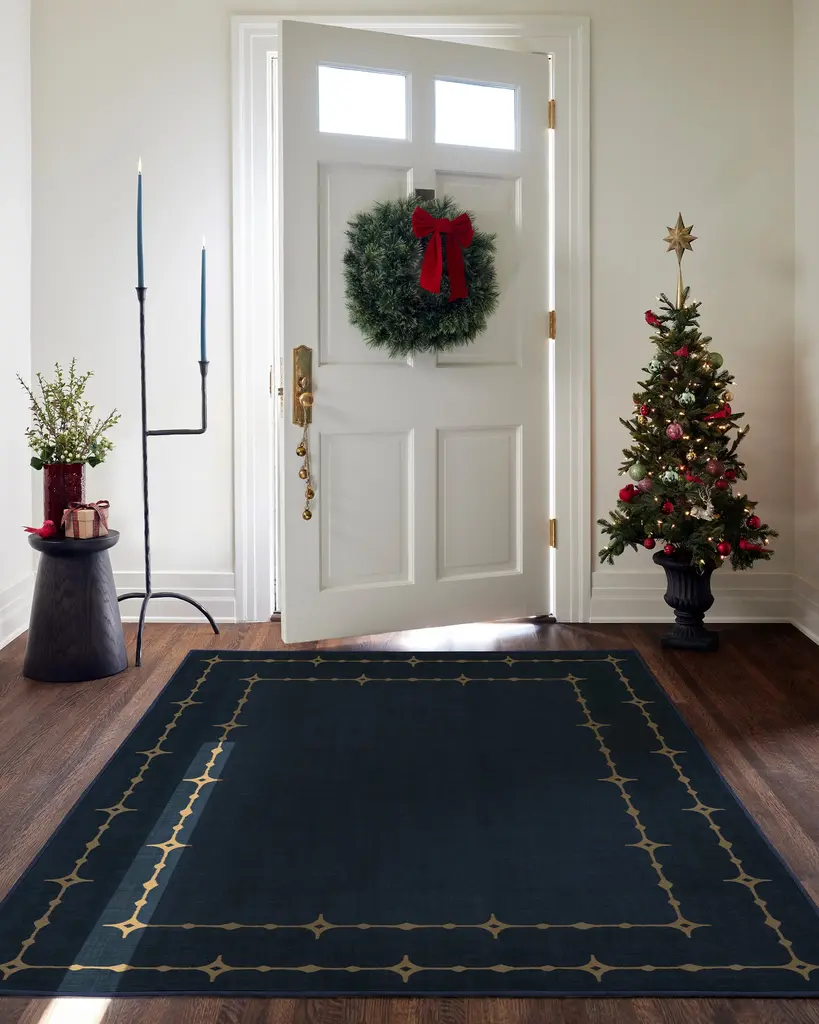 Transform your space into a starry dreamland with our Sparkle Border Dark Navy Rug. This celestial holiday design enchants with a starlit, gold-toned border filled with sparkling dots and diamonds that truly shine against a deep navy background. Water-resistant, stain-resistant, and machine-washable. Rug colors may vary slightly according to your device and the lighting in your space.