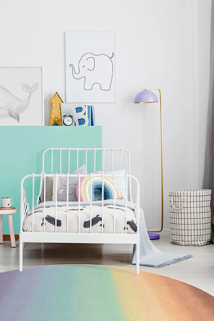 Our Spectrum Rainbow Rug is what kids' bedroom dreams are made of. Seventeen happy colors, with a mesmerizing watercolor wash effect, come together to create this playful rainbow stripes motif that's sure to brighten the mood in any kid's room.