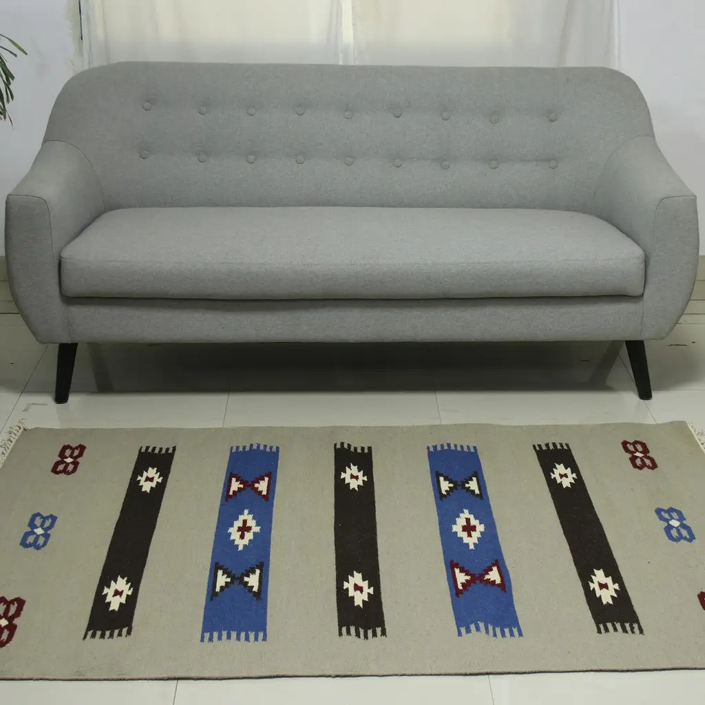 Presented by Sonik Sethi, this area rug from India is handwoven from wool by local artisans. Within an azure border, intricate spiral patterns and stripes decorate the length of this rug. Lovely fringes accent this rug at the ends.