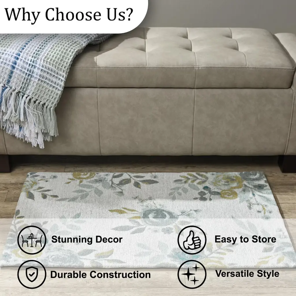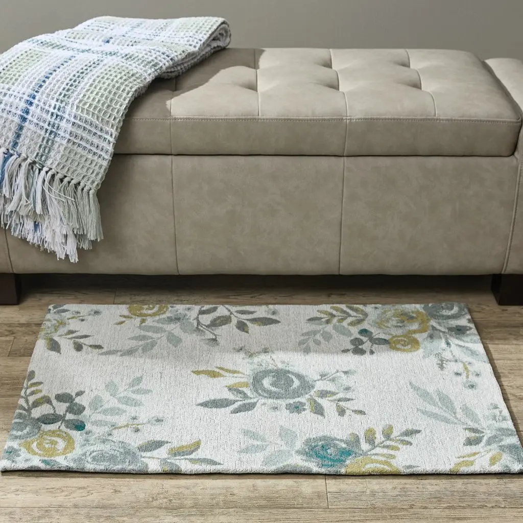 Transform your interior home setting with the comfortable woven texture and versatile hues of this subtle neutral floral indoor rug. Constructed from hand crafted cotton and polyester material for a long-lasting and durable decorative floor mat perfect to enhance any living space, providing an inviting path for guests and loved ones throughout the year. This patterned accent rug will easily enhance the look of an open room while also adding comfort and character from the beautiful botanical print and calming gray, golden yellow, and teal color palette.