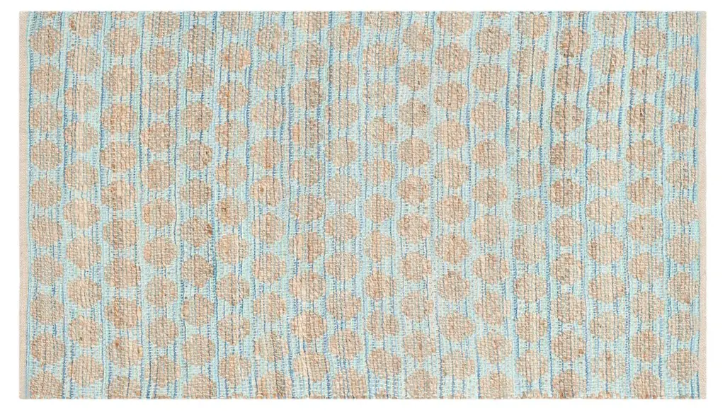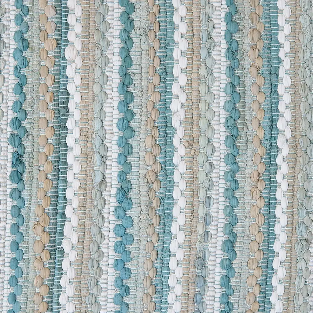 This textured accent rug introduces a soothing statement in beautiful shades of blue and beige. Intricately braided with thick cotton blend material of a timeless stripe design in teal, white, and tan hues that brings a casual flooring accessory to any room setting. Offers a stylish braided floor mat to use time and time again in your favorite country chic, coastal, farmhouse, summer, or bohemian room decor. The durable tightly woven construction that helps provide a protective barrier to a floor surface from daily wear and tear. Place in front of a chair or small sofa to define a reading nook and even as a kitchen mat in front of a sink or stove to add cushioned warmth to hard flooring for everyday tasks.